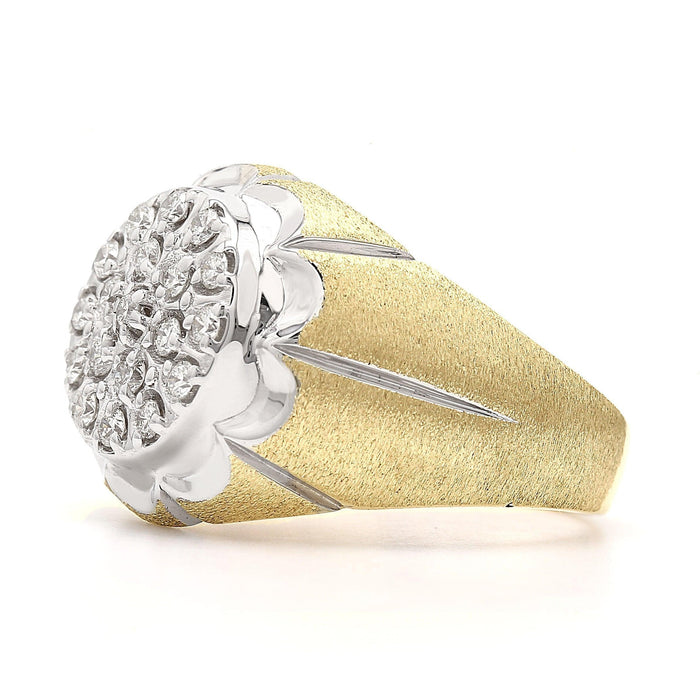 A classic men's lab grown diamond ring makes a striking impression. Crafted in 14K gold, this stunning design features a satin finished design that showcases a 1/2 carat cluster center of round F-G VS-SI lab grown diamonds. A sweeping artful design adds interest to this handsome piece.