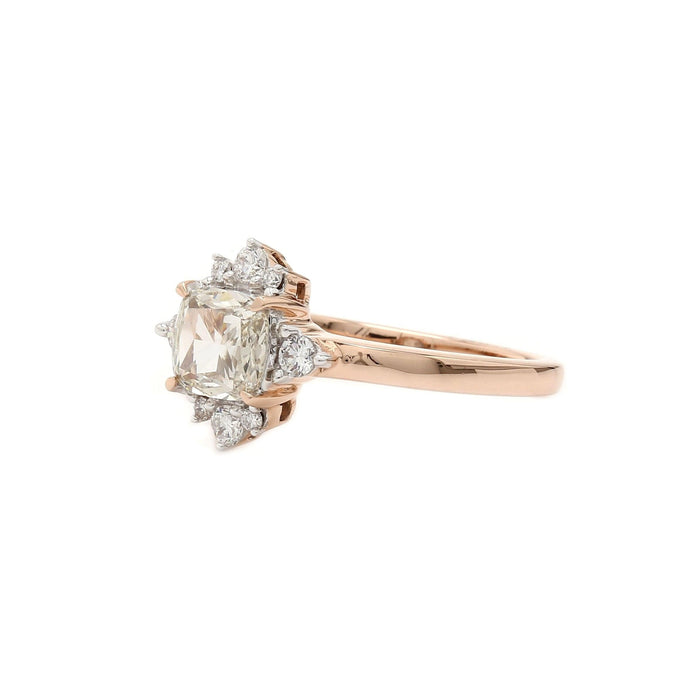Appeal to her vintage sensibilities with this shimmering lab grown diamond ring. Crafted in warm 14K rose gold, this antique look is centered with a dazzling 0.66 carat rose cut or Victorian color brilliant cushion cut center lab grown diamond. A classic frame composed of F-G, VS-SI round lab diamonds completes this charming choice. Buffed to a brilliant luster, this timeless ring is a treasured keepsake in the making.