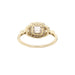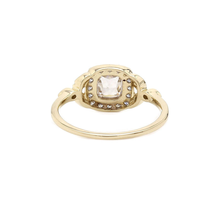 Bring this into any season with this sweet and shimmering vintage style ring. Crafted in warm 14K yellow gold, this antique look is centered with a dazzling 1/2 carat rose cut or Victorian color brilliant cushion cut center lab grown diamond. A pretty square halo frame composed of F-G, VS-SI round lab diamonds and intricate petal detailing completes this charming choice. Buffed to a brilliant luster, this clever ring is a treasured keepsake in the making.