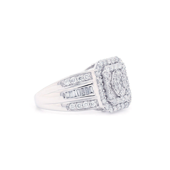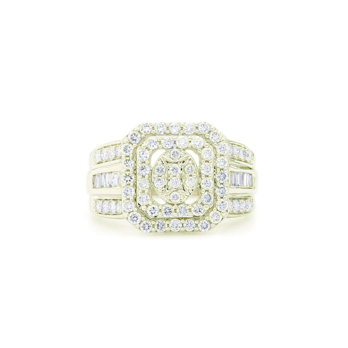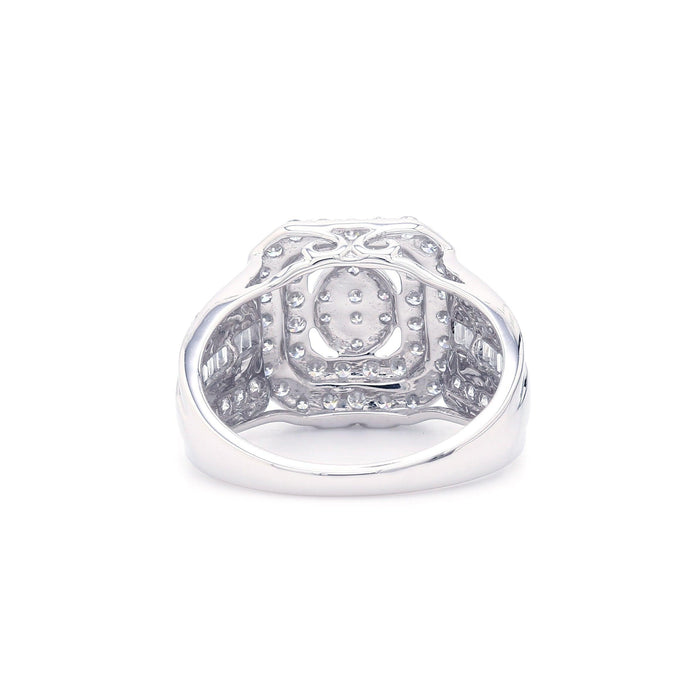 A fancy addition to her dressy attire, this lab grown diamond ring takes a look from ready to remarkable. Created in 14K gold, this marvelous choice showcases luscious F-G, VS-SI white lab grown diamonds in an oval composite and square halo design. The shank has three rows lining the wide band, with a center row of baguette diamond. Captivating with 1.00 carats of lab diamonds and a bright polished shine, this ring suits her sophisticated style.