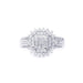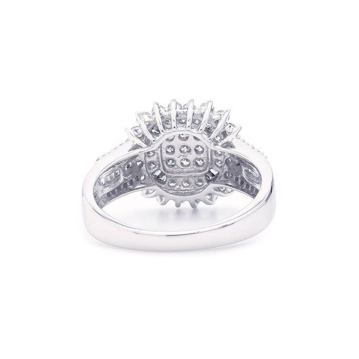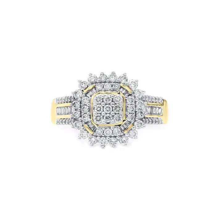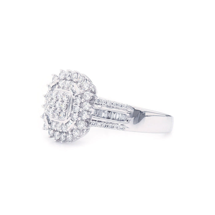 Stylish and alluring, this lab grown diamond ring takes a look from ready to remarkable. Created in 14K gold, this marvelous choice showcases luscious F-G, VS-SI white lab grown diamonds in a square composite cornered by baguettes and flower halo design. The shank has three rows lining the wide band, with a center row of baguette diamond. Captivating with 3/4 carats of lab diamonds and a bright polished shine, this ring suits her sophisticated style.