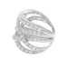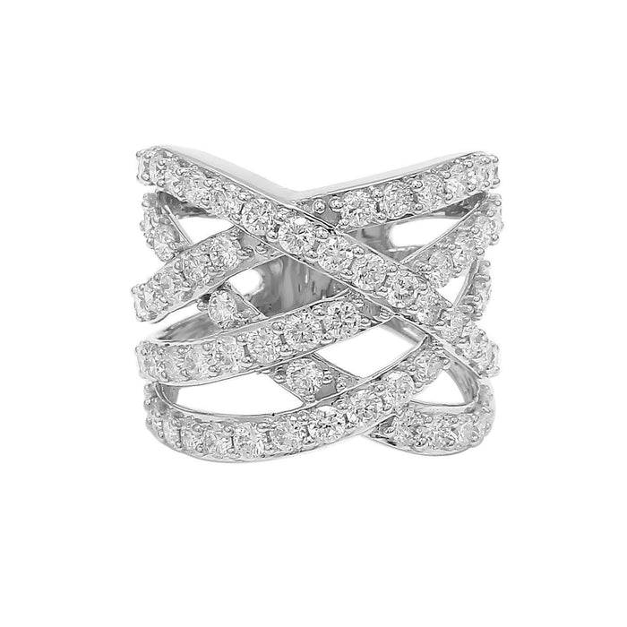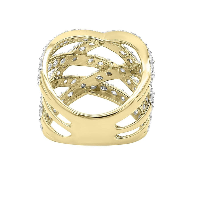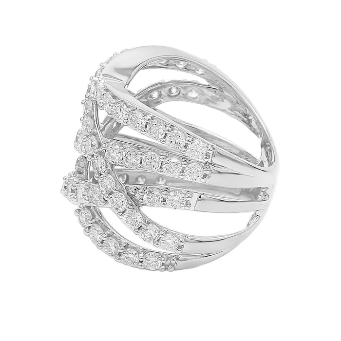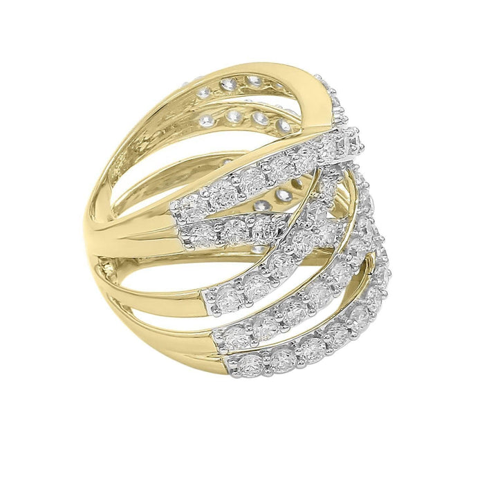 An abstract, bypass 14K gold band with 3.00 carats lab grown diamonds. This swirling design features shimmering F-G / VS-SI lab grown diamond-lined ribbons that cross over and twist open to an inspiring piece you'll love to wear.