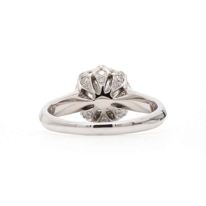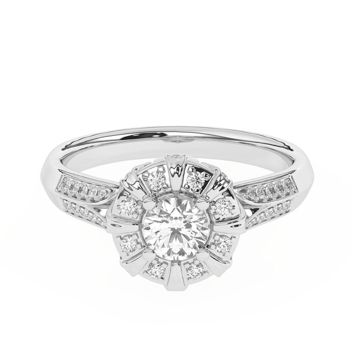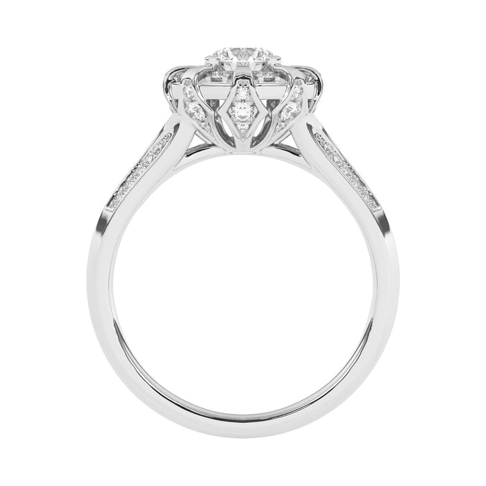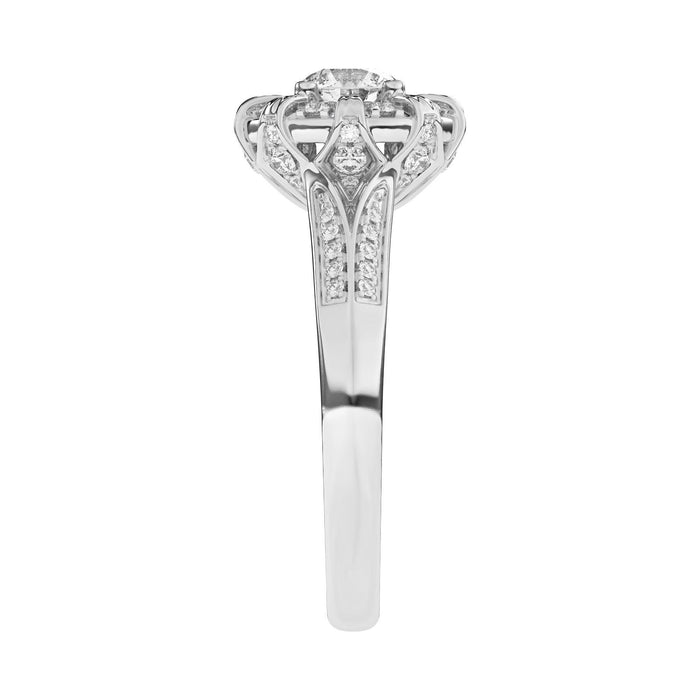Celebrate one unforgettable moment in your life with this lab grown diamond engagement setting. A stunning design in precious metal featuring a scallop crown, lab grown diamond lined halo that borders the center stone of your choice, while additional accent lab created diamonds line the split shank for a total of 1/3 carat weight.