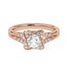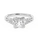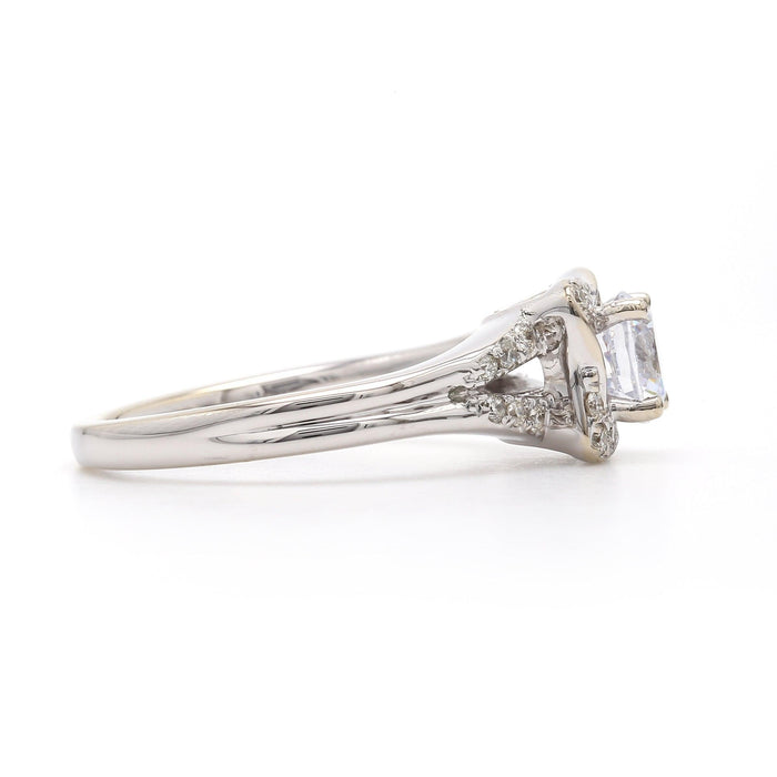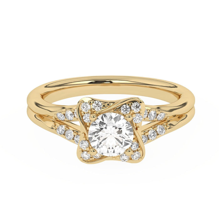 This engagement setting dazzles artfully set to enhance size and sparkle of the lab grown diamond you choose wrapped in a square frame Victorian style ribbon halo and split shank with 1/4 carat total weight of lab created diamonds set in a fine gold or platinum ring.