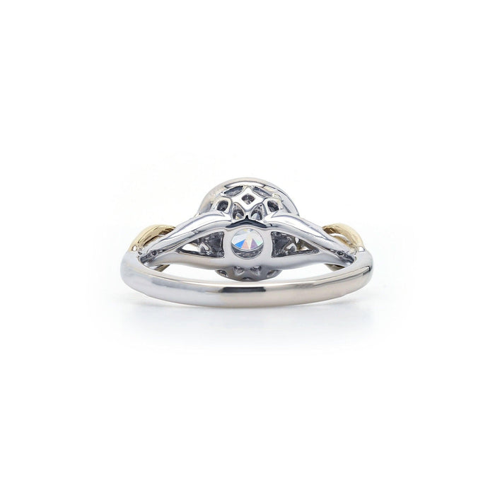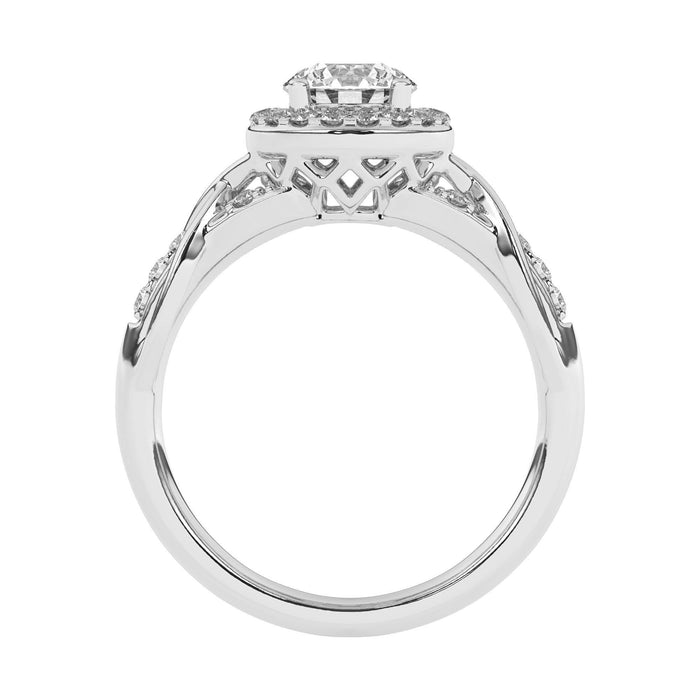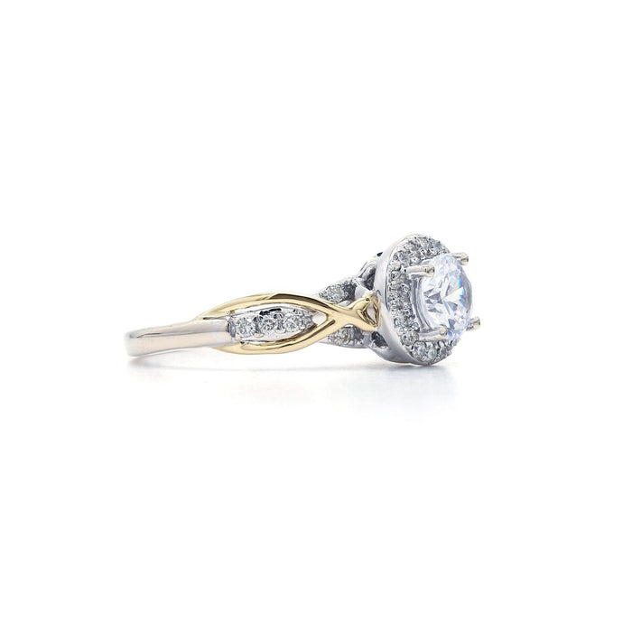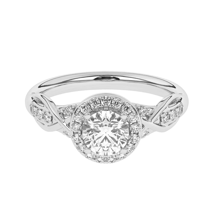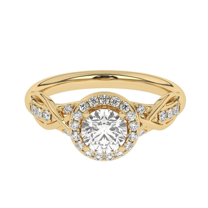 A touch of color flare with this shimmering lab grown diamond ring. Crafted in fine gold or platinum, this shimmering choice features a halo design to artfully hold the lab grown diamond of your choice. To enhance size and sparkle, a polished yellow gold ribbon flows around the white gold and the lab 1/4 carat total weight diamond lined shank. Radiant, this ring marks any occasion with style.