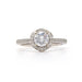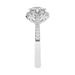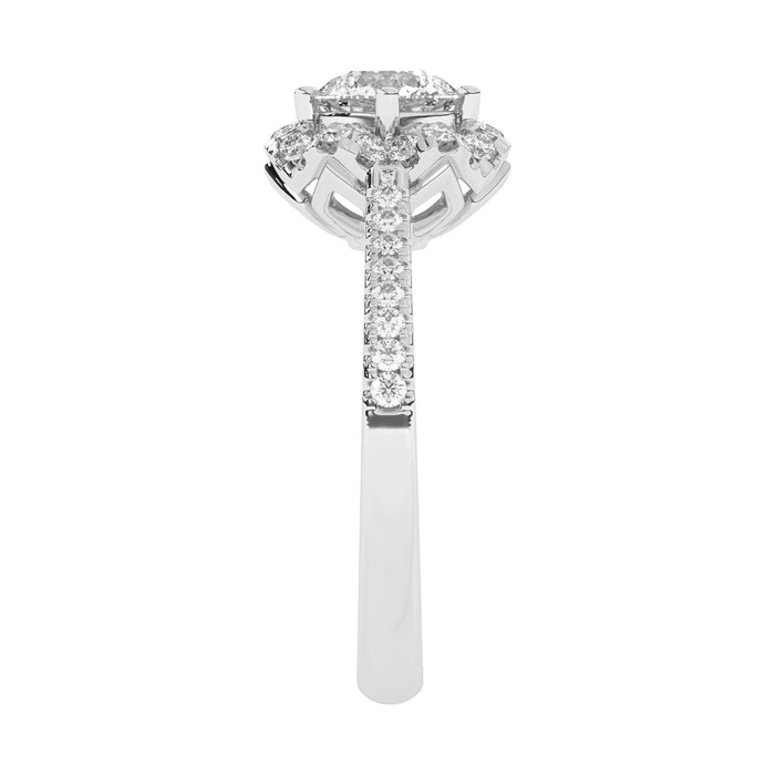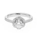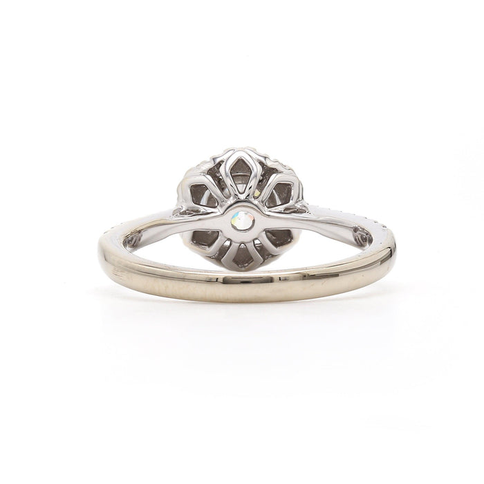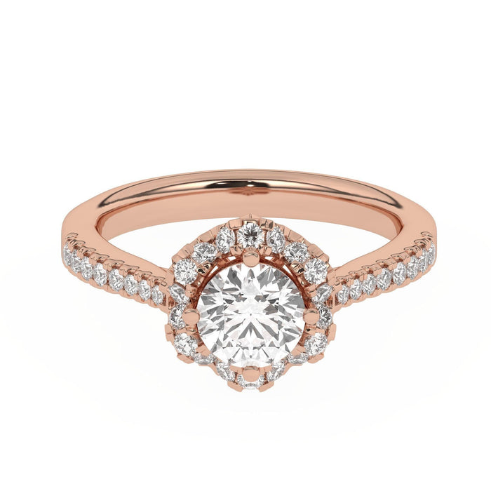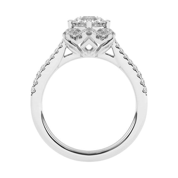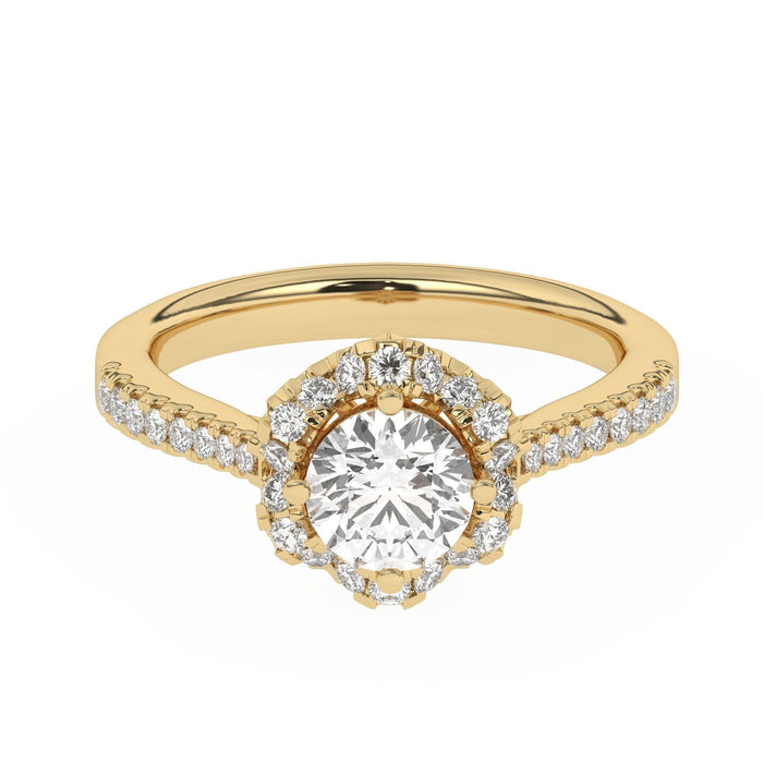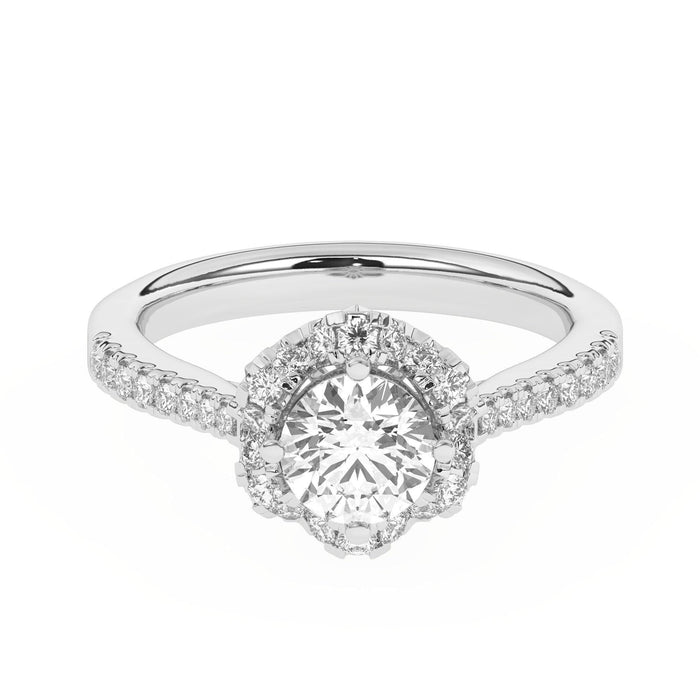 An unique vintage inspired lab grown diamond engagement setting. Crafted in fine gold or platinum, this traditional style features a halo frame of lab created diamonds and additional diamonds that line the ring's slim shank. Shimmering with 1/3 carat total weight of lab grown diamonds to set the center of stone of your choice, this engagement ring is certain to become a treasured keepsake.