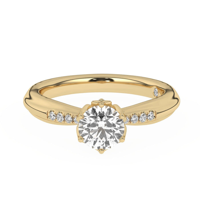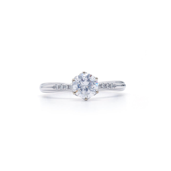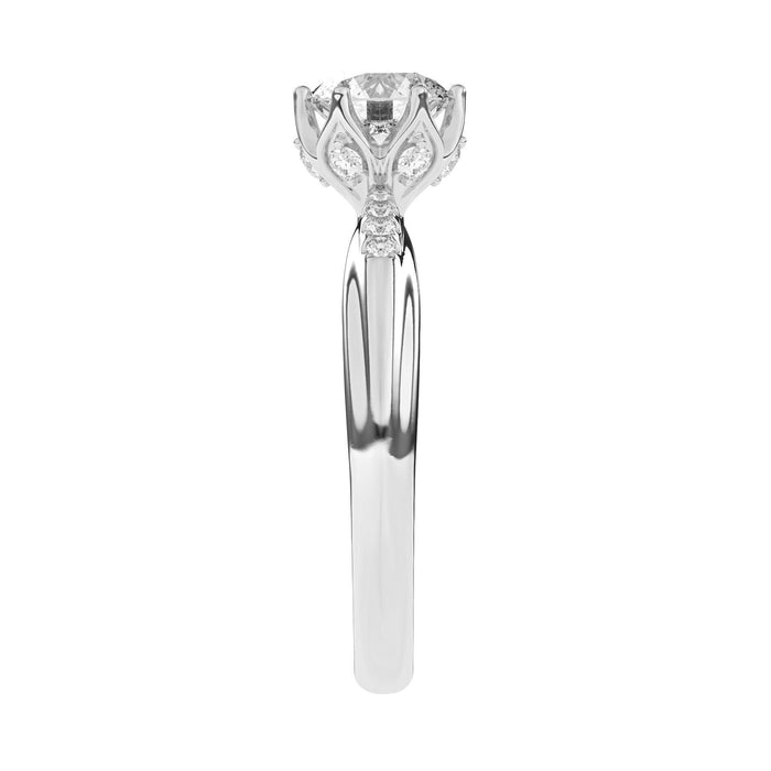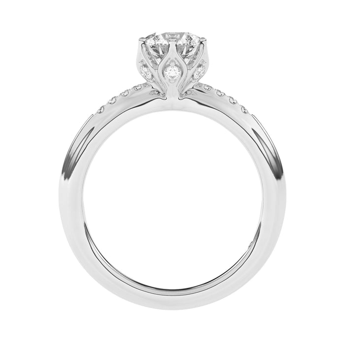 Beautifully crafted of precious metals, gold or platinum, this stylish engagement setting features a raised six prong crown like center mounting flanked on either side by smaller lab grown diamond accents, totaling 1/7 carats. Diamond color is F-G and clarity is VS-SI.