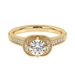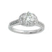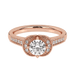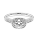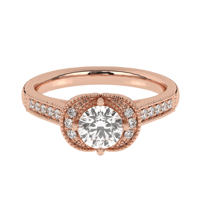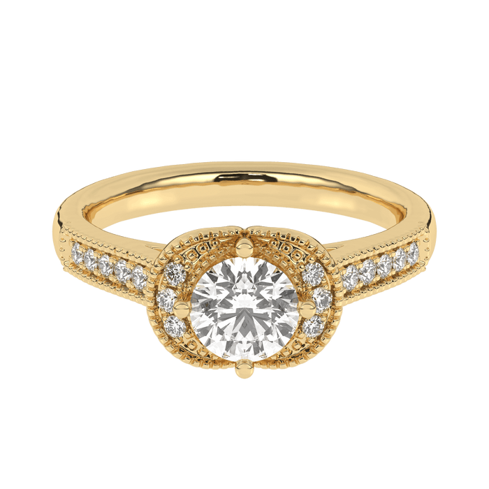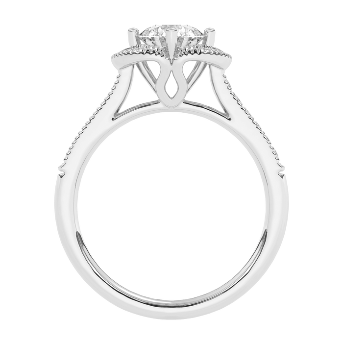 A stunning vintage style lab-grown diamond engagement setting. Crafted in precious metals, the center stone you choose will rise above a lab created diamond half moon halo and high polished circle loop underneath the center stone. A prong set shank completes 1/5 carat total weight look.