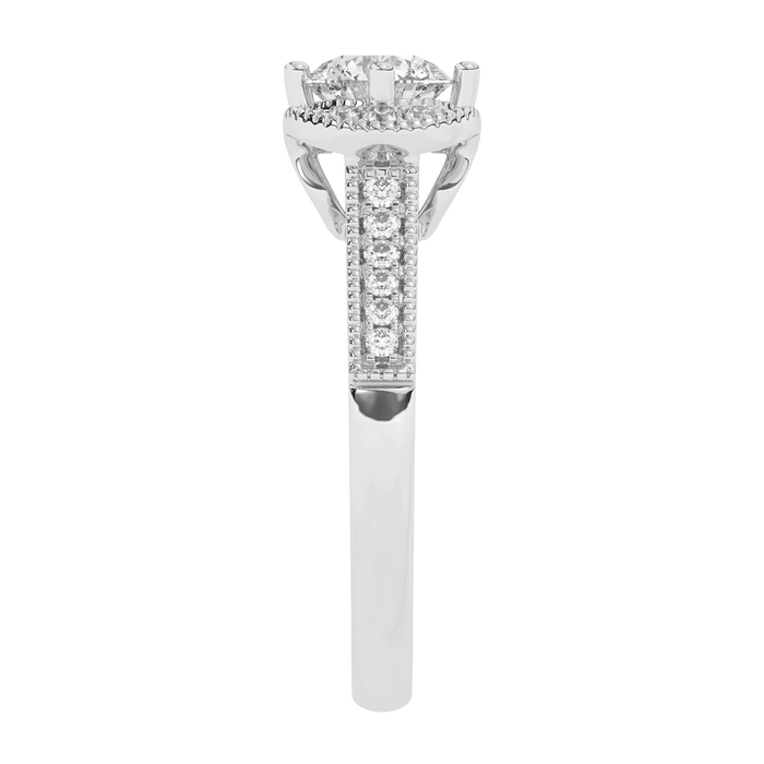 Depending on the choice of your center lab created diamond, the setting diamond weight will adjust proportionately to keep the same desired style. Smaller diamonds or different shaped diamonds will cause the prong count to adjust or the whole center will adjust to the best fit for that loose lab diamond you chose.