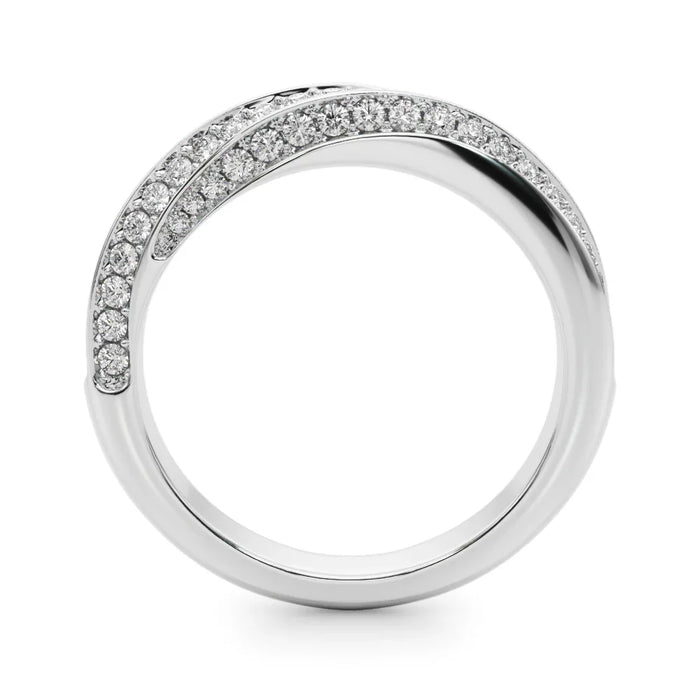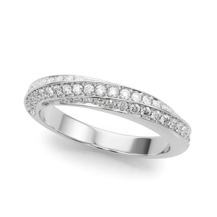 The sophisticated design featuring precisely set diamonds totaling 5/8 carat weight arranged in a distinctive twisted row configuration. This architectural approach creates visual dimension through the interplay of light and shadow along the band's contours. Designed as a versatile stackable piece, this band can function independently as a statement ring or integrate harmoniously with complementary bands to create a personalized collection. The meticulous diamond placement ensures consistent brilliance from every viewing angle.