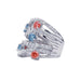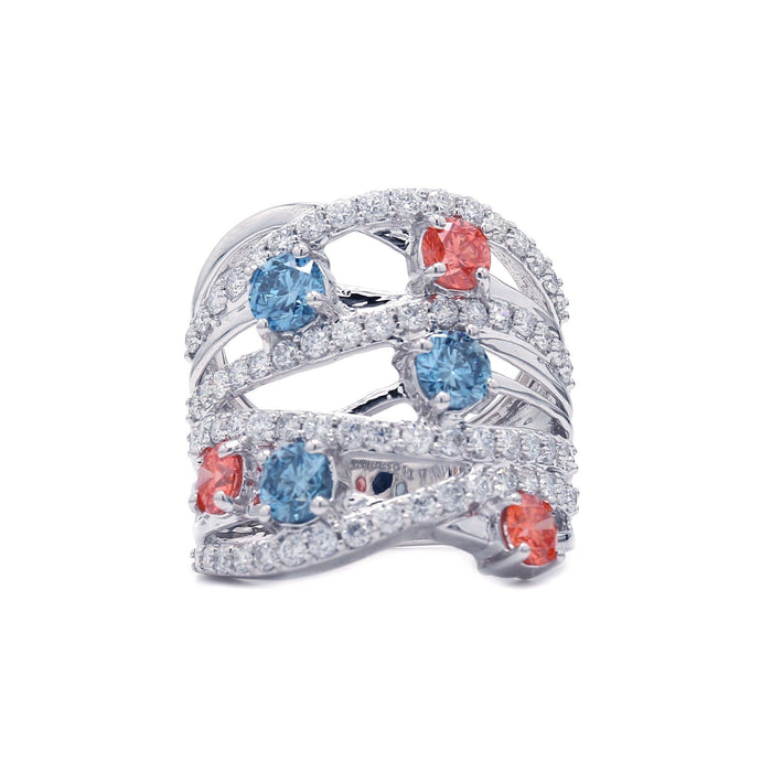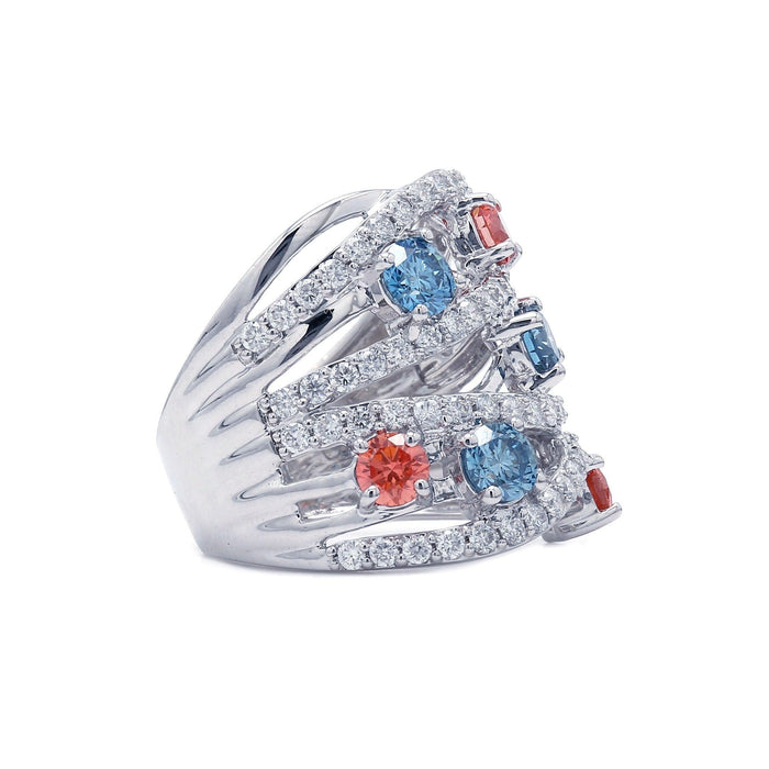 Wrap your finger in a sleek, stylish blue, pink and white lab grown diamond ring. This splendid design features a blue and a pink lab grown diamond set among the open work and dazzling white F-G / VS-SI lab grown diamond lined ribbons. A modern day bold 14K gold band that totals 3 1/5 carats.