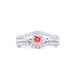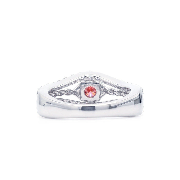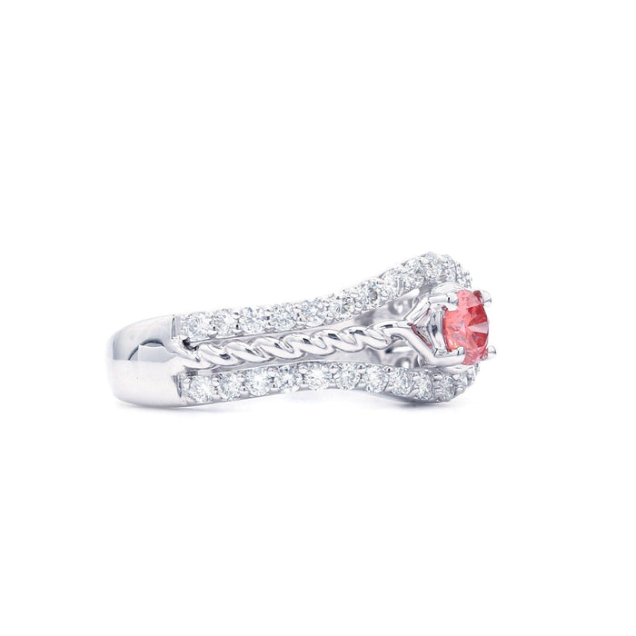 Add a vibrant pop of color to your that special day with this beautiful pink and white lab grown diamond bridal ring. Crafted in 14K white gold, this design has a 1/3 carat pink lab created diamond set in a solitaire rope style ring enhanced by two dazzling white lab grown diamond lined bands, giving the appearance of three rings in one. The white lab grown diamonds have a F-G color and VS-SI clarity for a totaling 3/4 carats set in white gold for a great look.