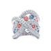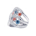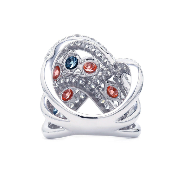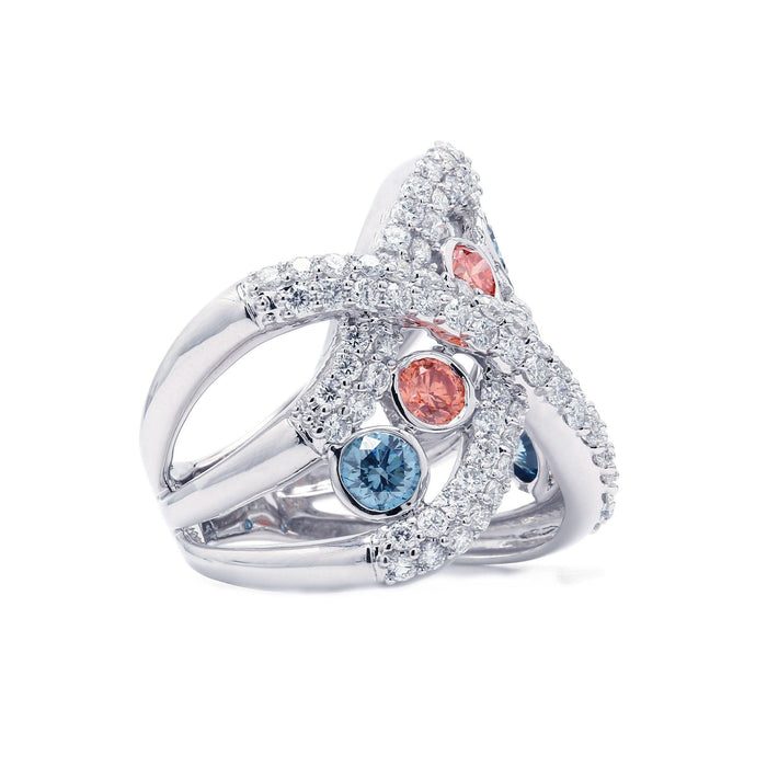 An abstract, bypass 14K gold band with bezel set blue and pink lab grown diamonds. This swirling design features shimmering F-G / VS-SI lab grown diamond-lined ribbons that cross over and twist open to bezel set blue and pink lab colored diamonds for a 3 3/4 carat total weight. Truly an inspiring piece you'll love to wear.