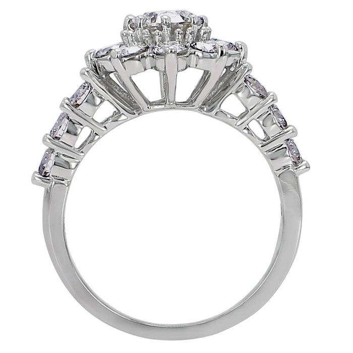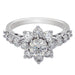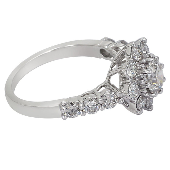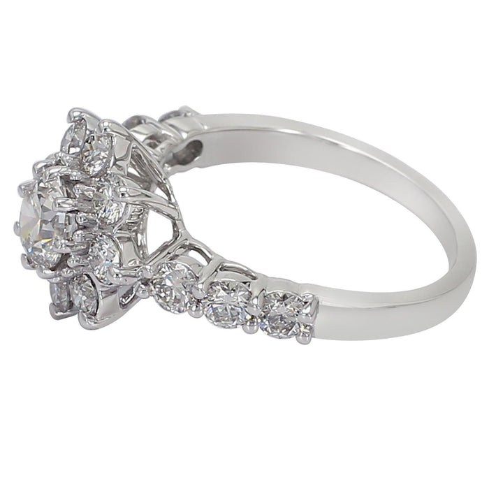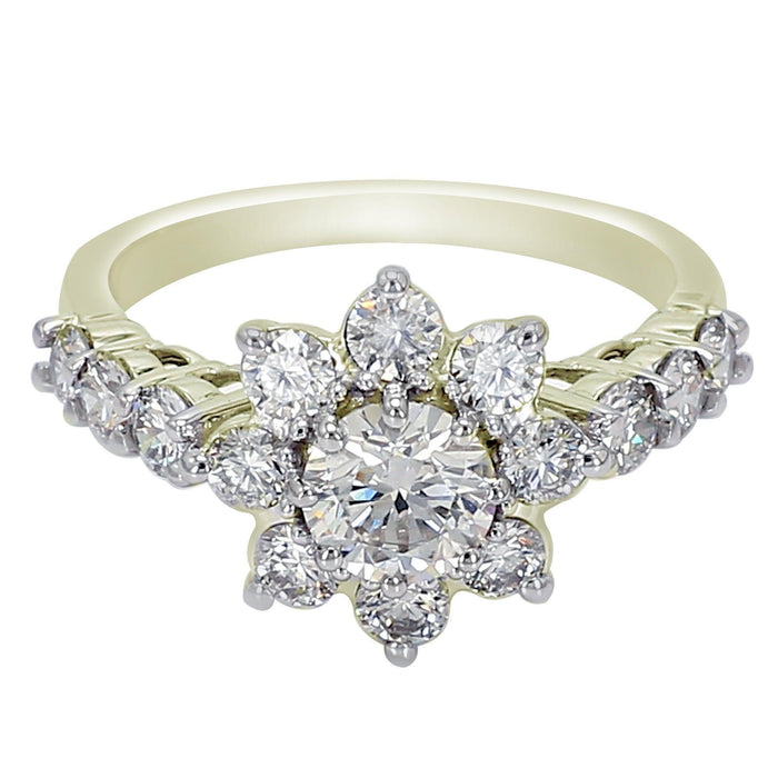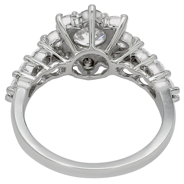 Exquisitely crafted in 14K white or yellow gold, this style is lined with glistening round I-J color and VS-SI clarity white lab created diamonds that completely encircle the in a flower like appearance the center stone. Dazzling with a total of 2.0 carats of lab grown diamonds, buffed to a brilliant shine. Lovely alone or paired with a band to make this a lab grown diamond bridal set, this traditional design is an elegant choice for either right or left hand rings.