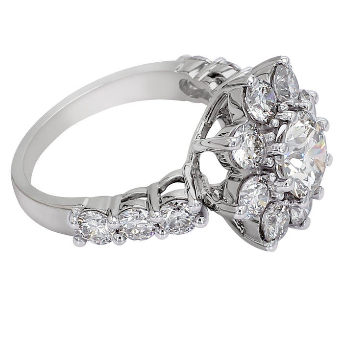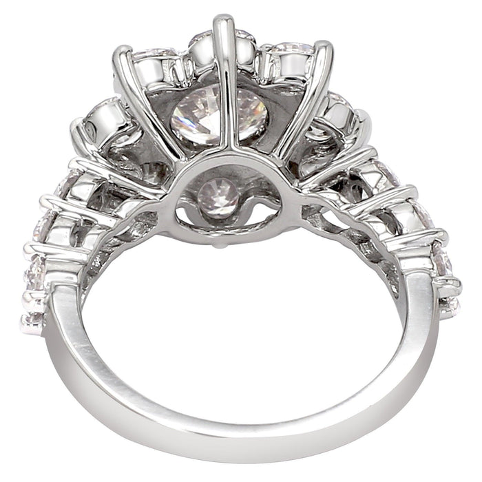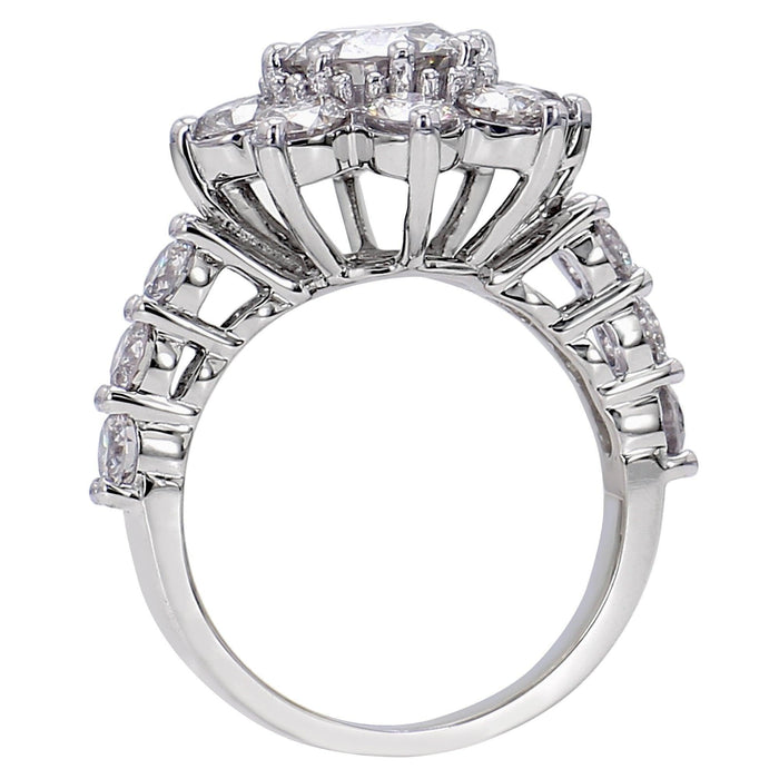 Exquisitely crafted in 14K white or yellow gold, this style is lined with glistening round I-J color and VS-SI clarity white lab created diamonds that completely encircle the in a flower like appearance the center stone. Dazzling with a total of 4.0 carats of lab grown diamonds, buffed to a brilliant shine. Lovely alone or paired with a band to make this a lab grown diamond bridal set, this traditional design is an elegant choice for either right or left hand rings.