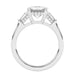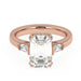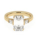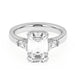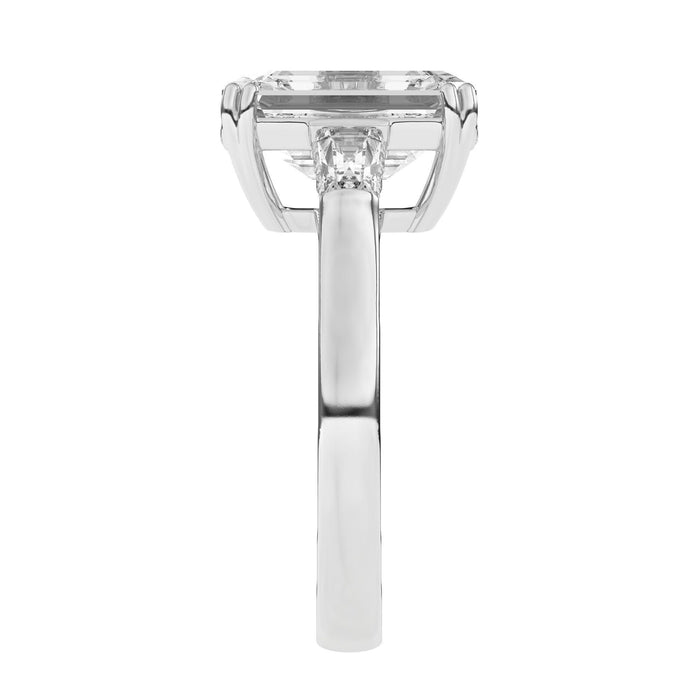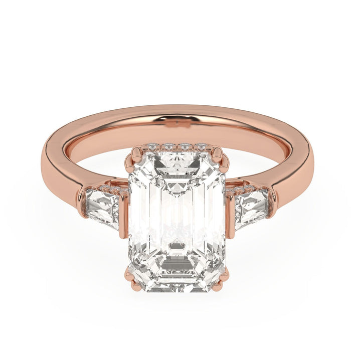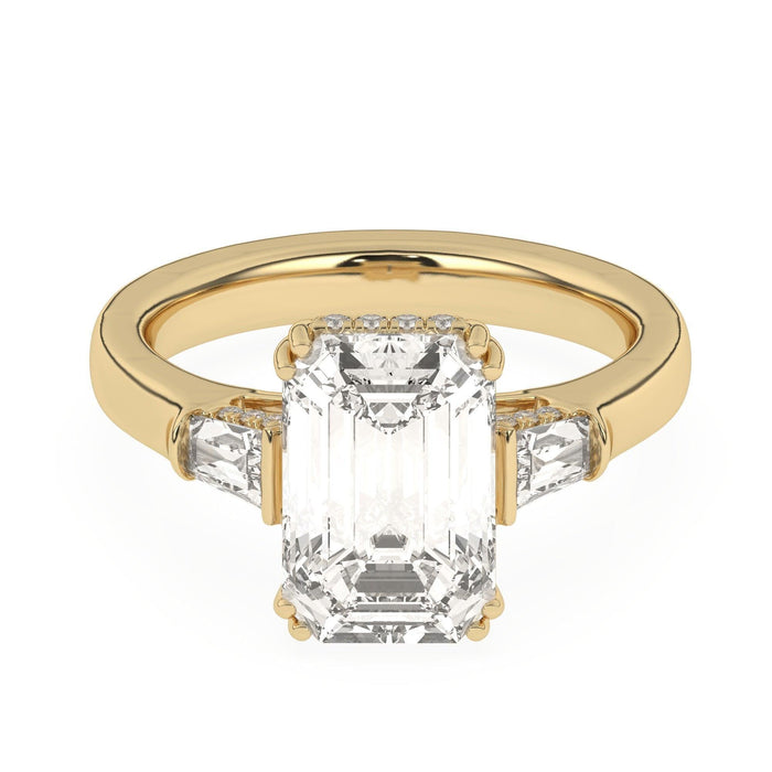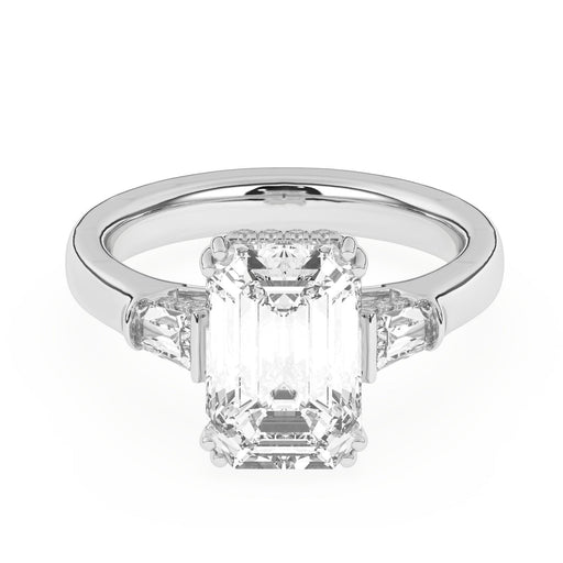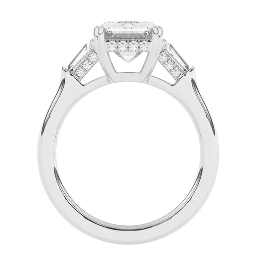 This perfect emerald or radiant shaped engagement ring features the classic three stone look in a gold or platinum band. Tapered baguettes on the side all three stones have a hidden style lining giving it a 3/5 carat total weight for a dynamic look. Add a certified lab grown diamond of your choice. lab created diamonds have a F-G / VS-SI ranking.