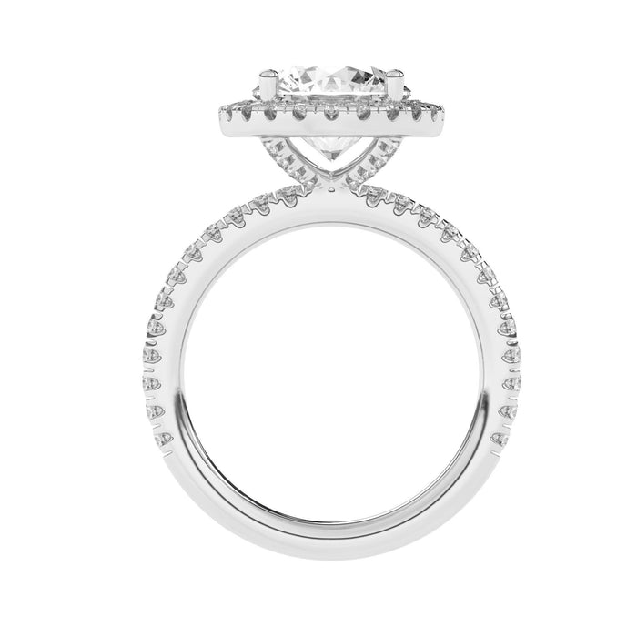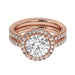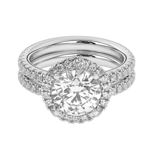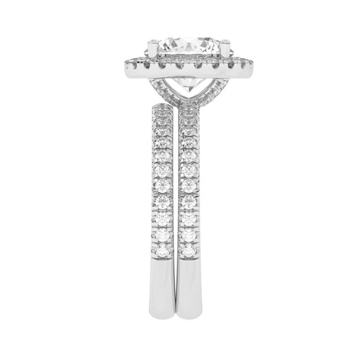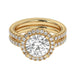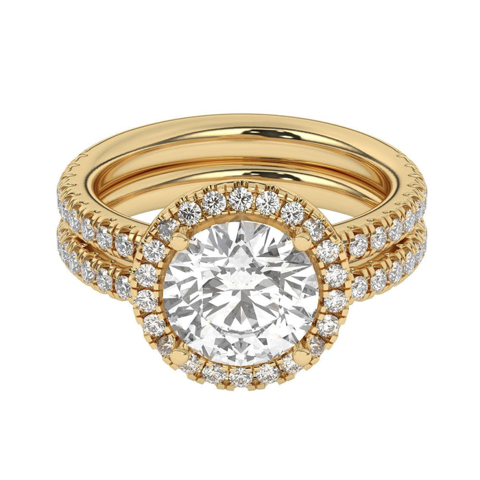 This perfect round halo bridal set features the amazing halo for a large look in a gold. Add a certified lab grown diamond of your choice. A classic diamond accented shank, surprise diamonds under the halo and a matching wedding band add to this show stopping bridal set of 1.0 carats of lab grown diamonds that sparkle in fine F-G / VS-SI ranking.