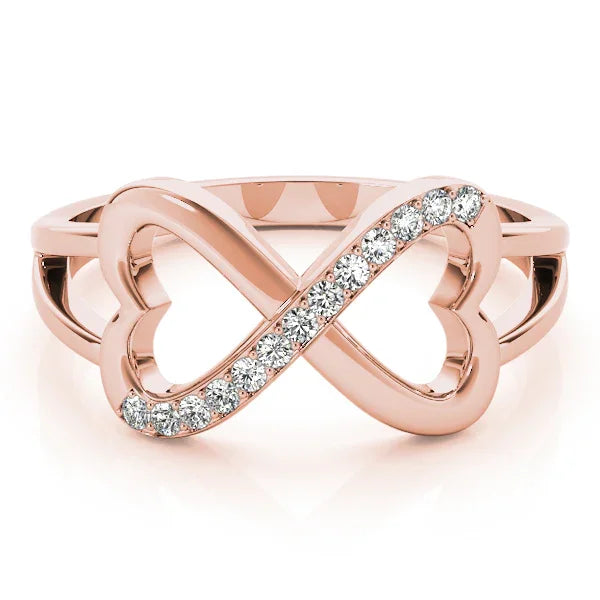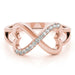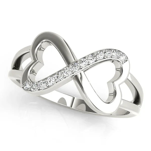 This infinity heart diamond ring boasts thirteen lab diamonds equaling 1/8 total carats, in F-G color and VS-SI clarity. Modern and timeless, this piece serves as a symbol of eternal love and commitment. Add a touch of sparkle to any look with this beautiful ring in either gold or sterling silver.
