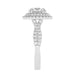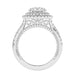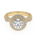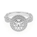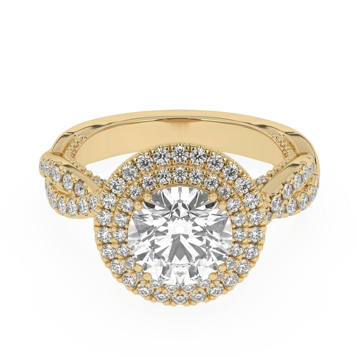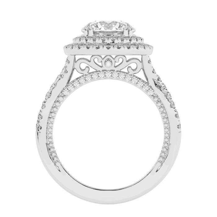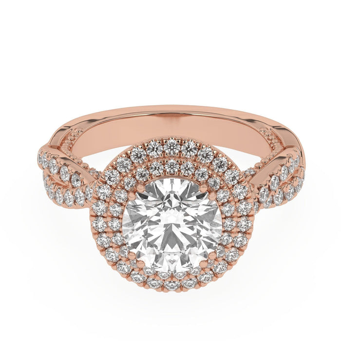 This double halo engagement ring features a gold or platinum twisted band and surprise detailed work, all accented with side 1.0 carat total weight of lab grown diamonds in F-G color and VS-SI clarity. Add a certified lab grown diamond of your choice to complete this ring. This setting is meant for center diamonds round in shape and with a minimum of 2.0 carats in weight.