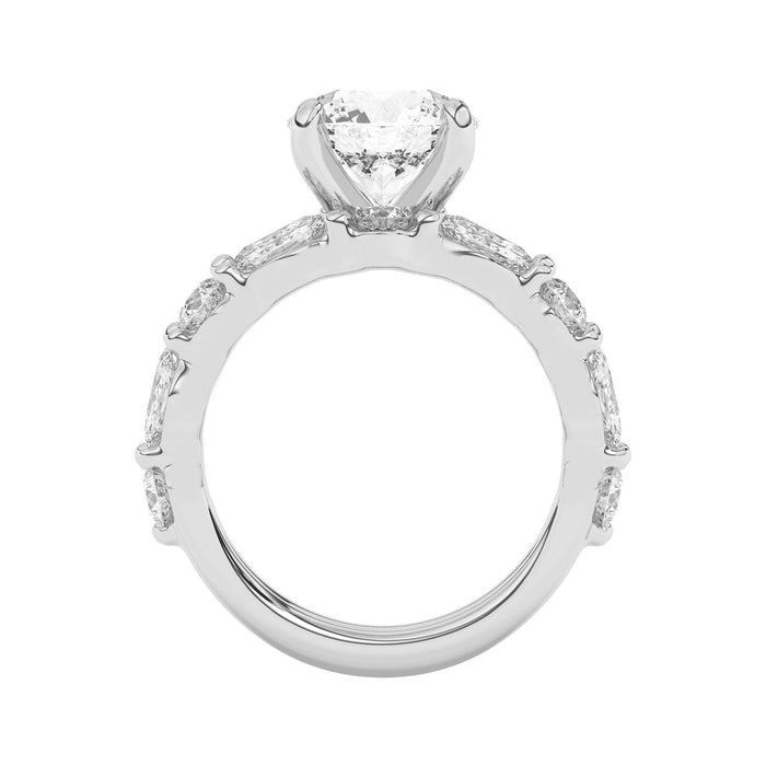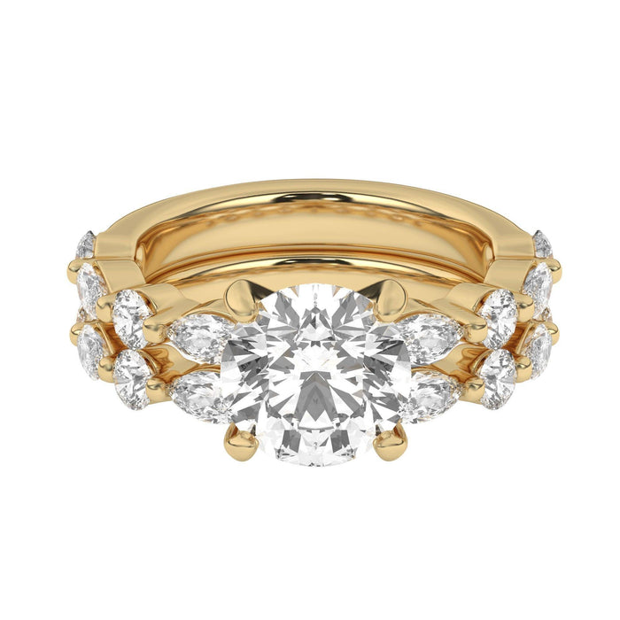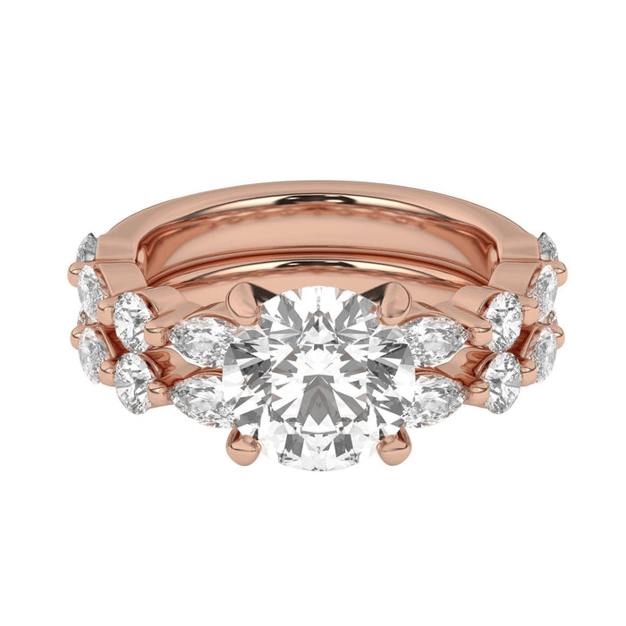 Simply inspired alternating diamond shapes amazing bride set. A gold or platinum band and matching wedding band highlights the alternating diamond shapes band giving the set a 1 3/4 carat total weight of round and marquise lab grown diamonds in F-G color and VS-SI clarity. Add a certified lab grown diamond of your choice. Not recommended for diamonds less than 1 1/2 carats.