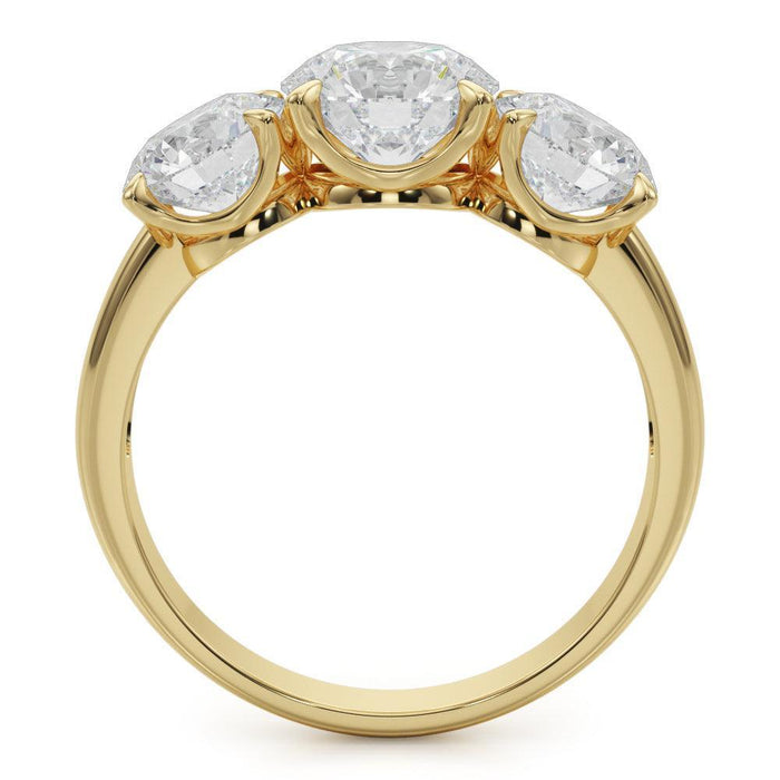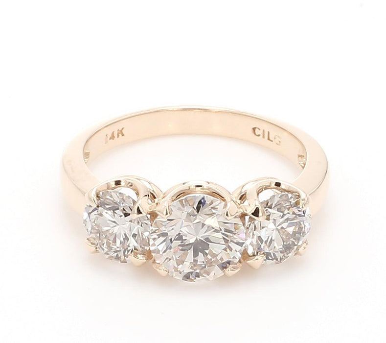 Fashioned in precious 14K yellow or white gold, this Classic three stone design highlights 3.00 Carat total weight of I-J color VS-SI ranking lab grown diamonds. This generous style ring is destined to delight and it's the perfect style for coordinating with different band rings for a creative look.