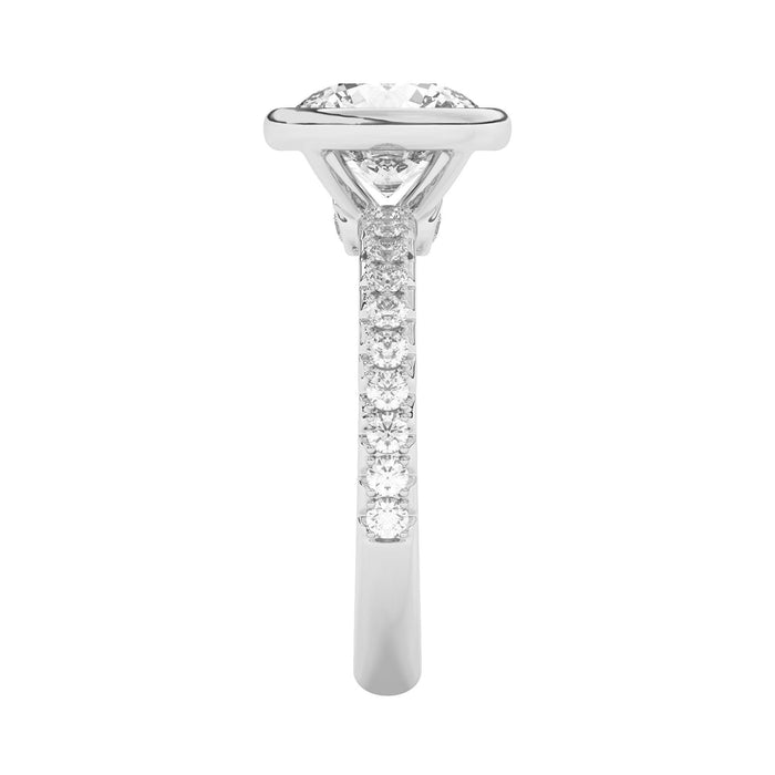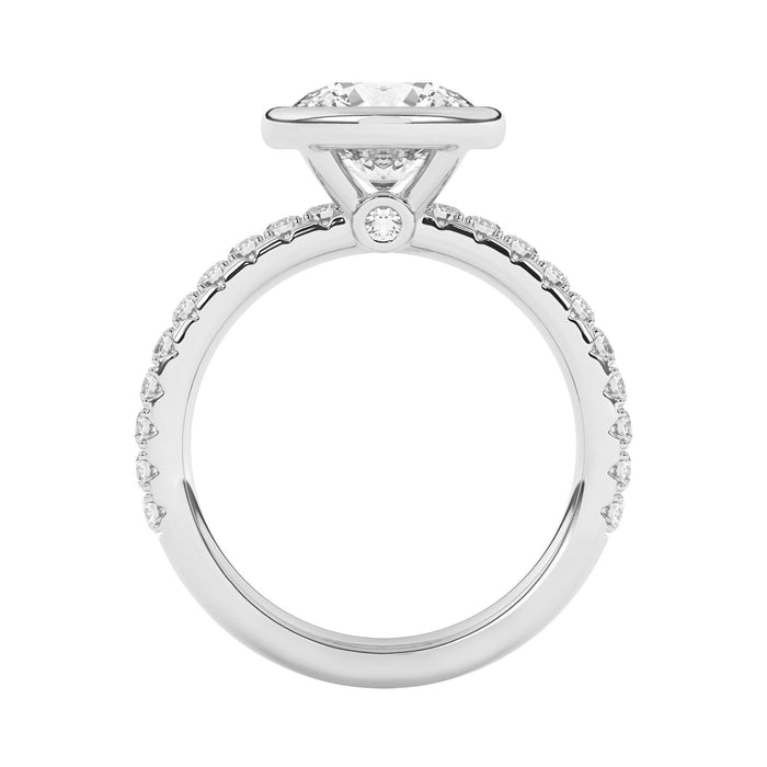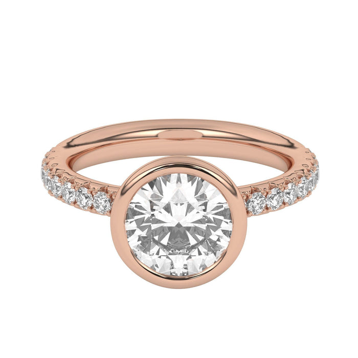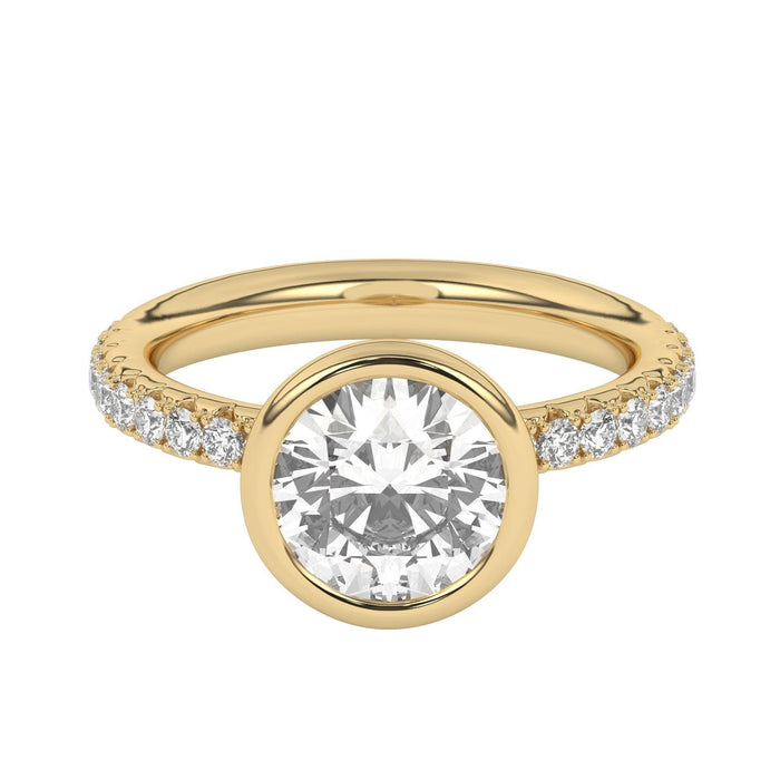 This perfect bezel style halo engagement ring features a gold band accented with 1/2 carat total weight of lab grown diamonds in F-G color and VS-SI clarity. Add a certified lab grown diamond of your choice.