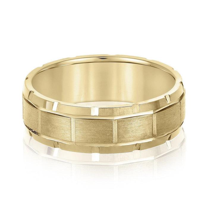 Show your commitment with the Miles Wedding Band. Crafted with precision, the ring features a beveled look and subtle design making it perfect for everyday wear. Made from durable material, the ring is available in 5mm or 6mm widths.