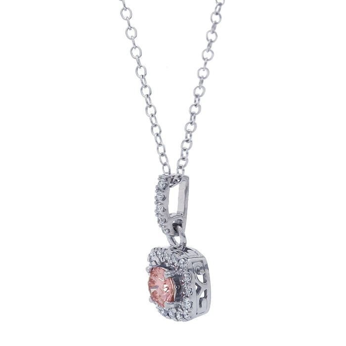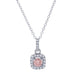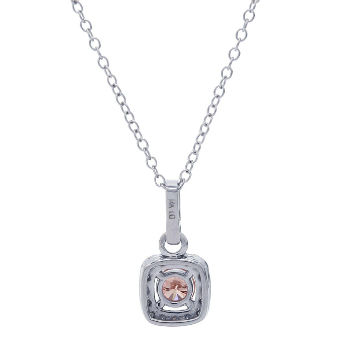 Ready for any occasion, this sweet pink and white lab grown diamond pendant is delightful. Crafted in 14K gold, this pretty pendant features a 1/3 carat pink color lab diamond wrapped in a halo frame of shimmering F-G, VS-SI white lab diamonds totaling 1/6 carats. Radiant with 1/2 carat total weight of lab grown diamonds, a brilliant, buffed luster and dangling from a 16 inch chain with a two extension. The pendant is approximately 7.8mm wide by 14.9mm (including the bail) long.
