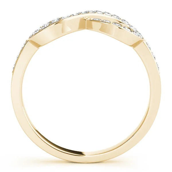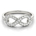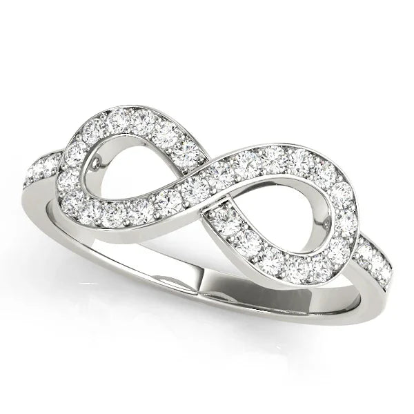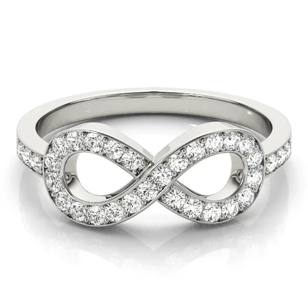 This timeless 14 karat gold ring is crafted with an elegant infinity design encrusted with 3/8 carats of lab diamonds of F-G color and VS-SI clarity. Perfect for symbolizing the everlasting infinity, this striking ring will dazzle and delight for years to come! Also available in Sterling silver.
