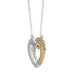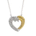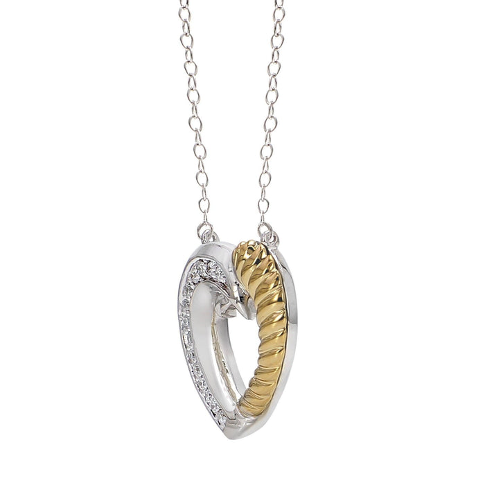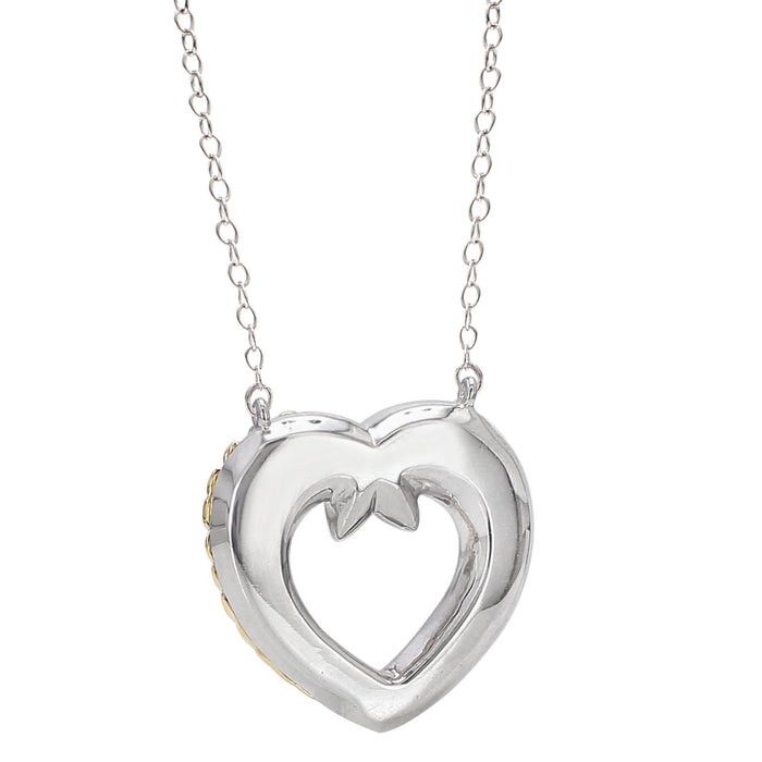 A truly timeless treasure, this white lab grown diamond heart pendant creates an eye-catching look. Crafted in 18K yellow gold and sterling silver, this open heart is stunning. A glittering array of sparkling lab grown diamonds totaling 1/5 carat line the raised silver frame. The pendant suspends along a sterling silver 16 inch chain that has a two inch extension for an 18 inch fit. Giving it a little diversity for occasion worn and secures with a lobster clasp for ease of wear.