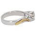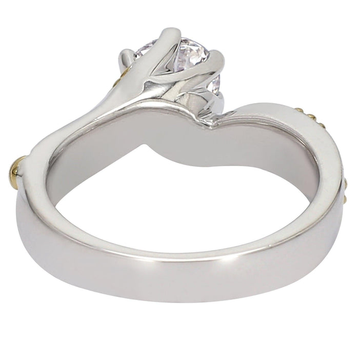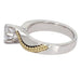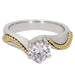 An exquisite choice that showcases a sparkling 1.00 carat round lab grown diamond solitaire in a timeless six prong solid setting merged into a polished sterling silver ring with an added flare of 18K yellow gold twist accent. The color is I-J with a clarity of VS-SI ranking. This ring is a simple yet versatile choice and one you can build upon. Traditional wedding bands on either side or other style, even custom made accompanying rings for a personal touch.