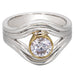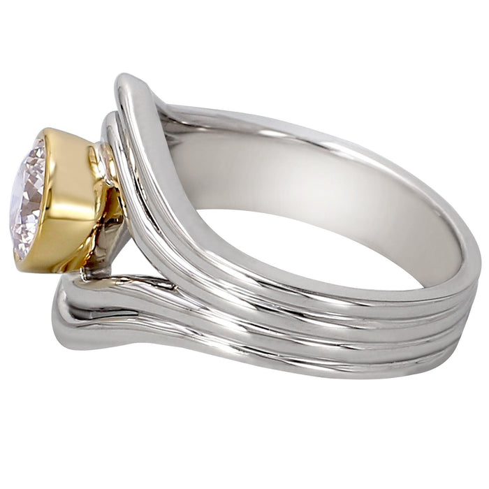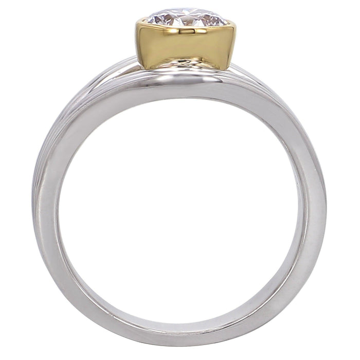 An exquisite choice that showcases a sparkling 1.00 carat round lab grown diamond solitaire set in a timeless bezel 18K yellow gold center that is elevated above an open polished sterling silver ring. The lab created diamond color is I-J with a clarity of VS-SI ranking. This ring is a simple yet versatile choice.