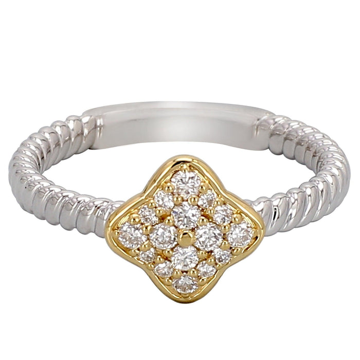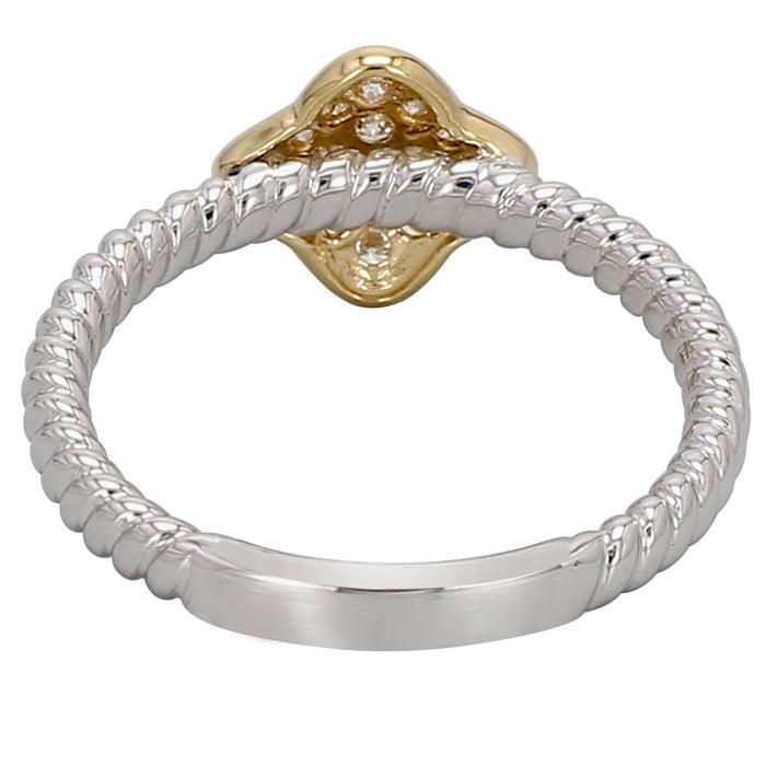 Destined to be stunning, this vintage-inspired lab grown diamond ring sounds with a symbol of luck. This shimmering design features sparkling lab created diamonds set in a clover-shaped 18K yellow gold frame atop a rope like sterling silver band. Great for stacking or just wearing alone. It's sure to be the perfect go to ring.
