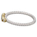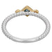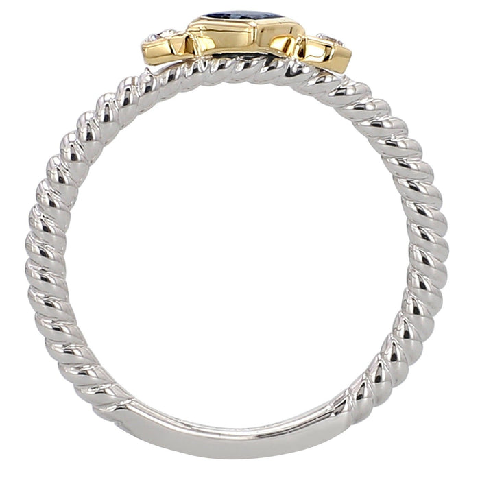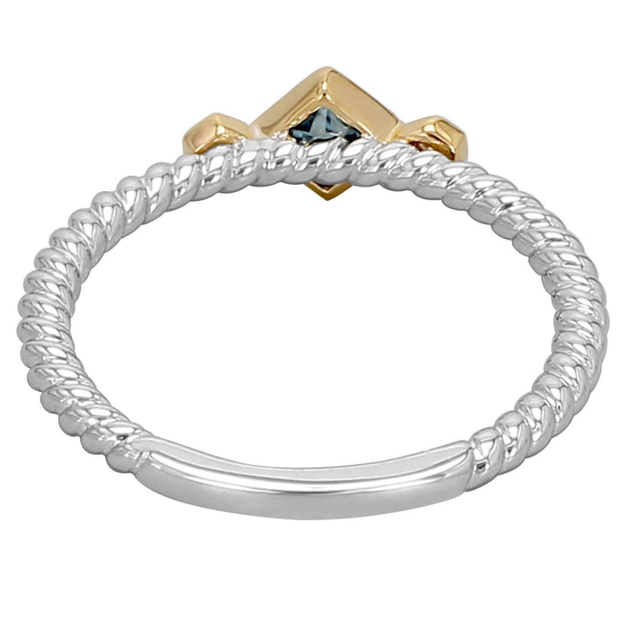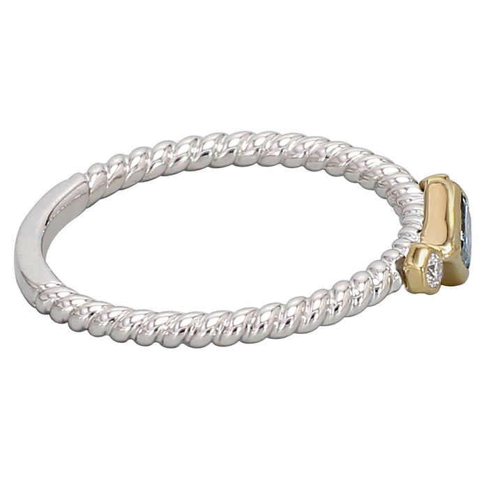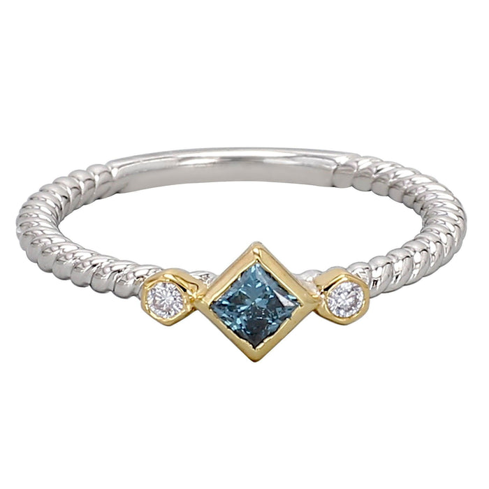 This sweet promise ring is a look of beauty. Gracefully swirling around the sterling silver band directs your attention to the 18k yellow gold center. This playful design sparkles with a half bezel set princess cut blue lab created diamond centered between two F-G, VS-SI white lab grown diamonds. A delightful look is certain to be treasured and with it's rope swirl and stackable design; it's perfect for a "just because" band.