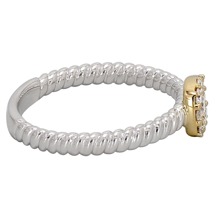 This sweet promise ring is a look of beauty. Gracefully swirling around the sterling silver band directs your attention to the 18k yellow gold center. This playful design sparkles with a cluster of F-G, VS-SI white lab grown diamonds giving the illusion of one larger round stone. A delightful look is certain to be treasured and with its rope swirl and stackable design; it's perfect for a "just because" band.