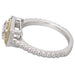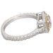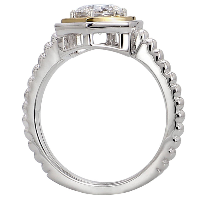 An exquisite choice that showcases a sparkling 1.00 carat round lab grown diamond solitaire in a six prong solid two tone octagon halo setting. 18K yellow gold accents the center while merged into a polished sterling silver setting and a flare of twist shank. The color is I-J with a clarity of VS-SI ranking. This ring is a simple yet versatile choice and one you can build upon. Traditional wedding bands on either side or other style, even custom made accompanying rings for a personal touch.