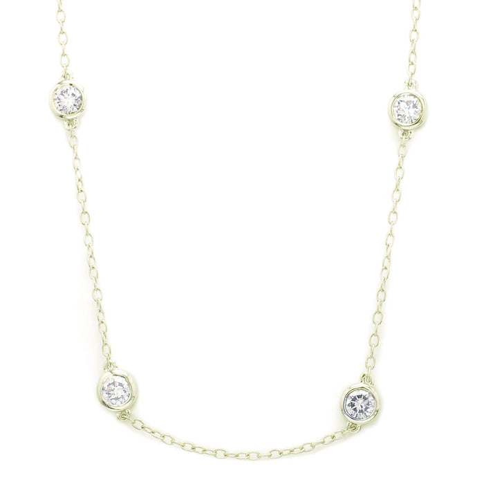 A delightfully modern look, this 14K gold necklace features shimmering lab grown diamonds that seem to effortlessly float around the neck. Ten polished stations spaced about the link chain, each bezel set, all totaling 5.00 carats. I-J color and VS-SI clarity white lab grown diamonds and classic elegance that's perfect for everyday wear and for the most glamorous of occasions.