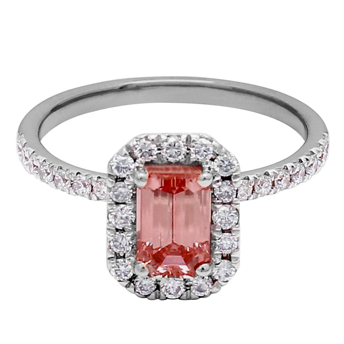 The Suzanne Ring is a beautiful statement of your love and commitment. Combined with a minimum 1.10 carat lab-created pink diamond center stone in an emerald cut, complemented by F-G VS-SI white diamonds flowing around the halo and down the shank gives this ring its 1.70 Ct. T.W. The diamond accents create a luxurious and timeless look, perfect for a memorable engagement.