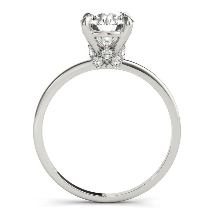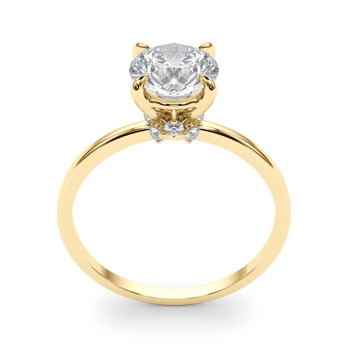 A Vintage Alberta 1/2 carat lab grown round diamond in K VS color/clarity features 1/8Ct. T.W lab-grown diamond accents in a hidden halo for a beautiful, ageless sparkle. Expertly crafted to last for generations, this engagement ring is the perfect way to add a vintage flare to this special occasion. This warm K color center diamond comes in faint yellow and light brown earth tones. It's off white tone gives it that vintage look.
