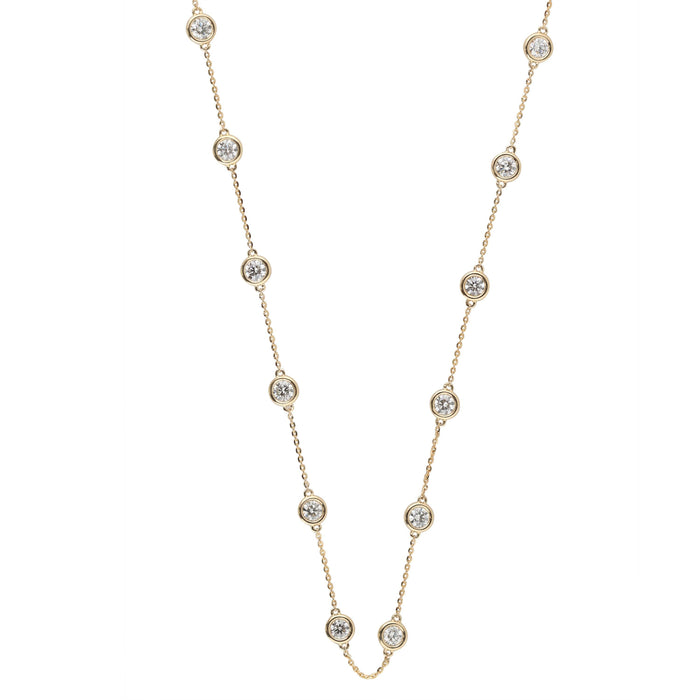 This Viola Necklace is a sophisticated statement in diamonds. Featuring a "Diamonds by the Yard" style design, the necklace boasts a 6.0 carat total weight of G-H VS-SI quality diamonds skillfully bezel set into stations along the chain. Perfect for special occasions, this necklace is sure to turn heads.