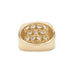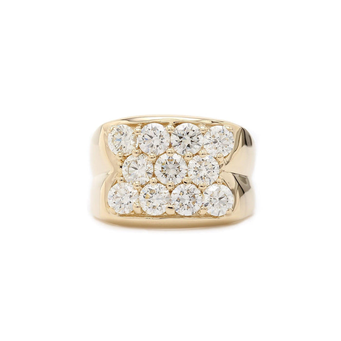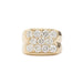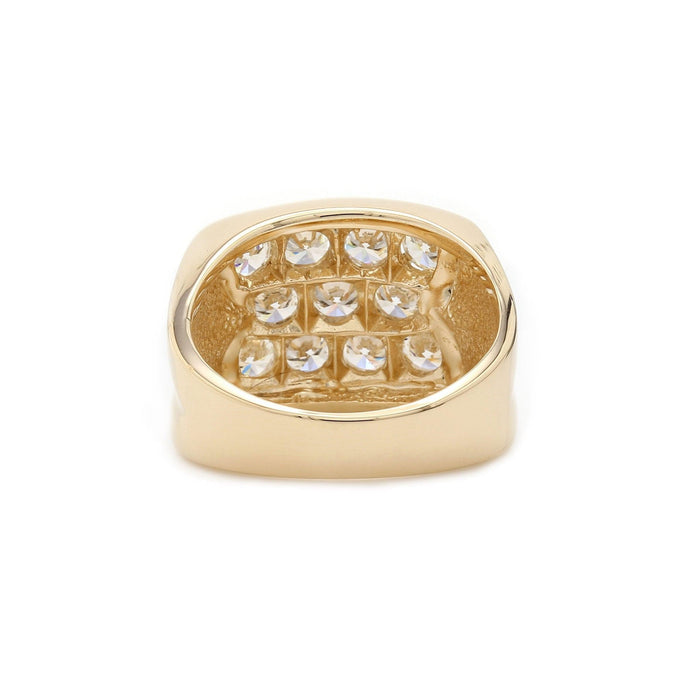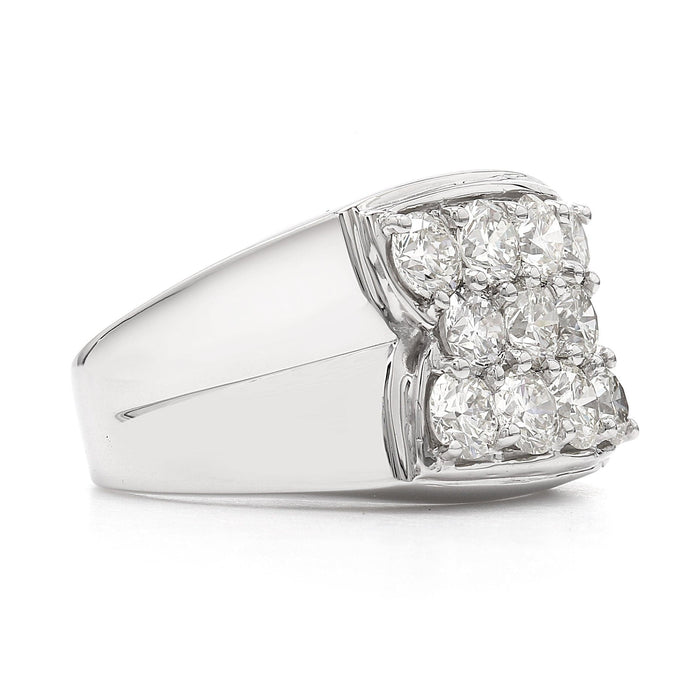 A masculine look, this lab grown diamond ring is for his contemporary style. Expertly crafted in 14K white or yellow gold, the eye is drawn to the 3.00 carat total weight cluster of shimmering round lab grown diamonds at the center of the ring. Curved in arches and high polished finish adds depth and dimension to the wide shank. Each round lab grown diamond has a I-J color and VS-SI clarity ranking.