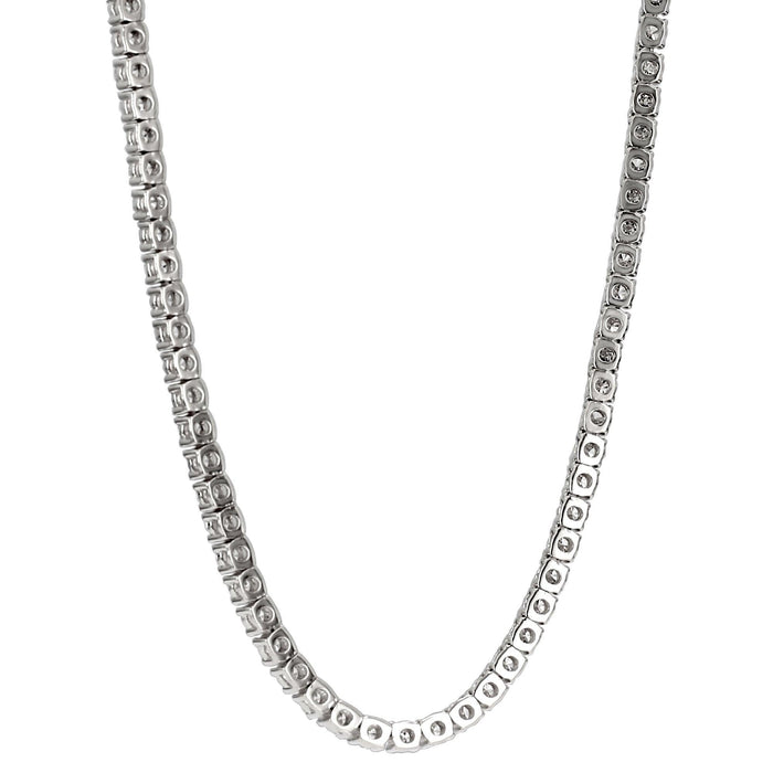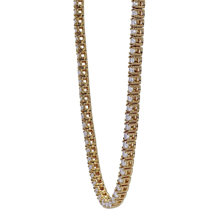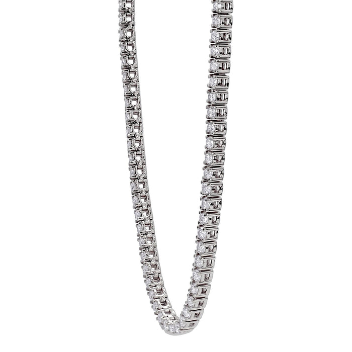 A classic tennis necklace embellishes the neckline with shimmering lab-grown diamonds. A row of round lab created diamonds with a color ranking of H-I and VS-SI clarity, radiates in 14K white or yellow gold. A mix of glamour and elegance, this 17.5 inch necklace secures with a tongue and groove clasp. This beautiful necklace can stand alone, extremely versatile and fits into any wardrobe to complement any occasion.