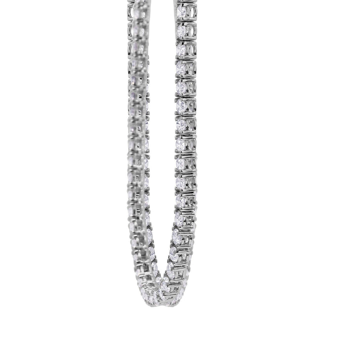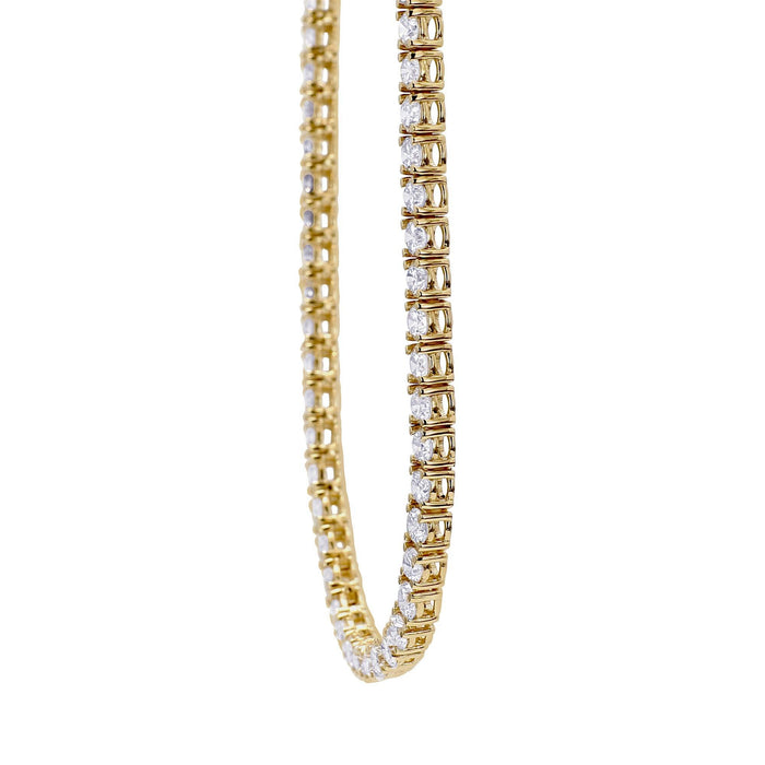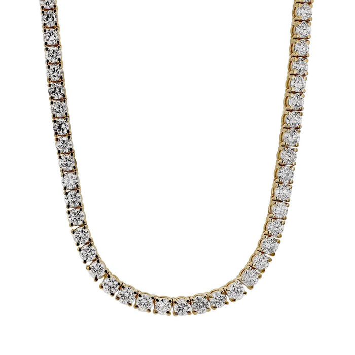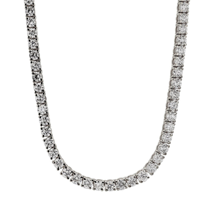 A classic tennis necklace embellishes the neckline with shimmering lab-grown diamonds. A row of round lab created diamonds with a color ranking of H-I and VS-SI clarity, radiates in 14K white or yellow gold. A mix of glamour and elegance, this 18 inch necklace secures with a tongue and groove clasp. This beautiful necklace can stand alone, extremely versatile and fit into any wardrobe and complement any occasion.