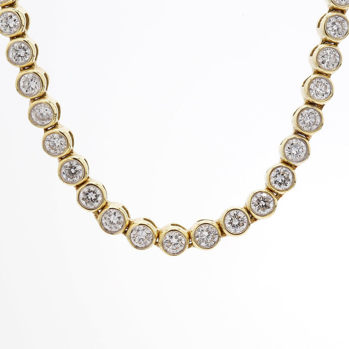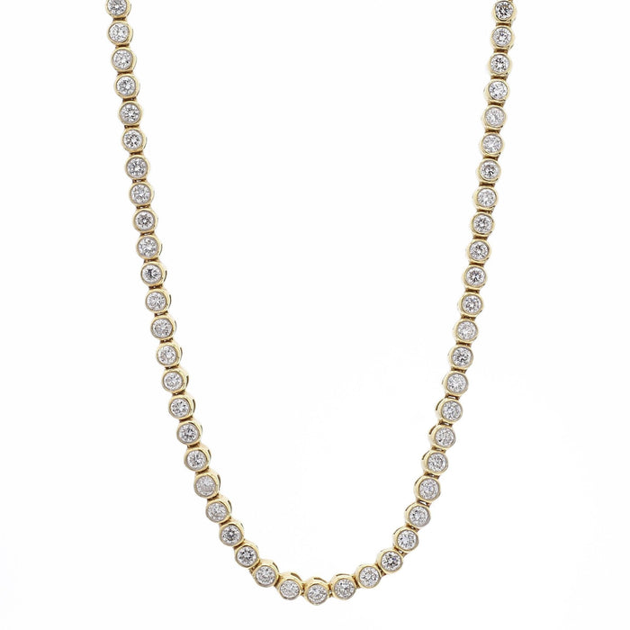 A beautiful 15.00 carat total weight lab grown diamond necklace that's an amazing choice for day or evening wear. Crafted in warm 18K white or yellow gold, this streamlined design features eighty eight sparkling bezel set diamonds in a 16 inch necklace. Radiant with a color ranking of I-J and VS-SI diamond clarity and secures with a tongue and groove clasp, a classic elegance that brings the right touch to your outfit.