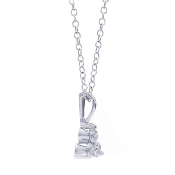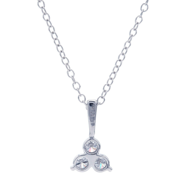 Add dimension to your outfit with the sparkle of this petite lab grown diamond pendant. Crafted in 14K white or yellow gold and formed into a triangle shape by three F-G, VS-SI lab grown brilliant round diamonds. Radiant with 1/4 carat total weight of lab diamonds and a bright polished shine. A stunning accessory that suspends along a 16 inch chain that has a two inch extension for a possible 17 inch or 18 inch fit. Giving it a little diversity for occasion worn and secures with a lobster clasp for ease of wear.
