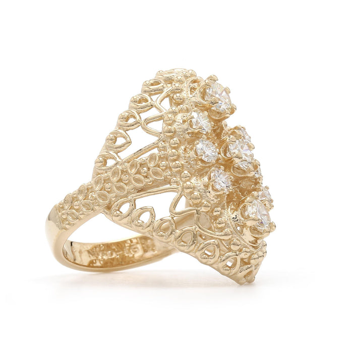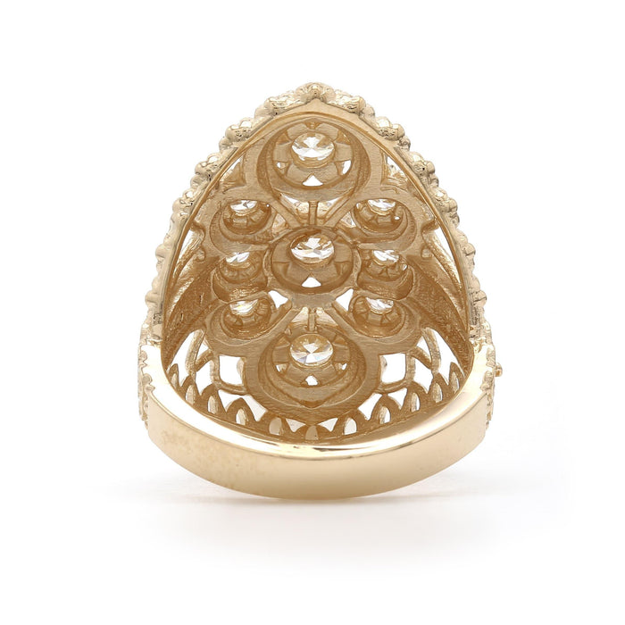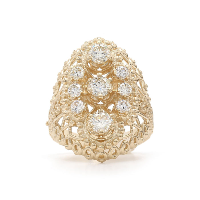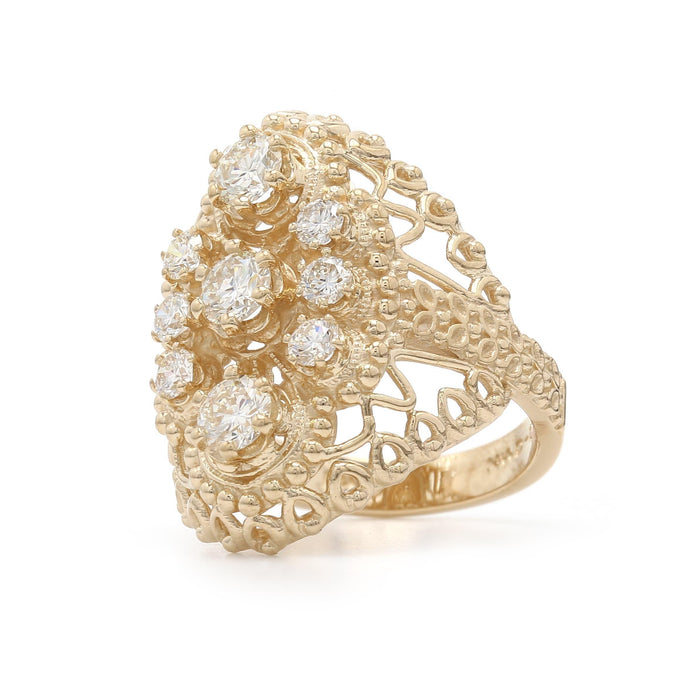 Dazzling and dramatic, this spectacular style highlights 1.25 carats total weight of lab grown diamonds vintage style marquise flare. Beautifully finished and ready for any formal occasion or just because. Crafted in 14K gold and the lab created diamonds have a color ranking of I-J with VS-SI clarity, this ring is sure to be the topic of conversation.
