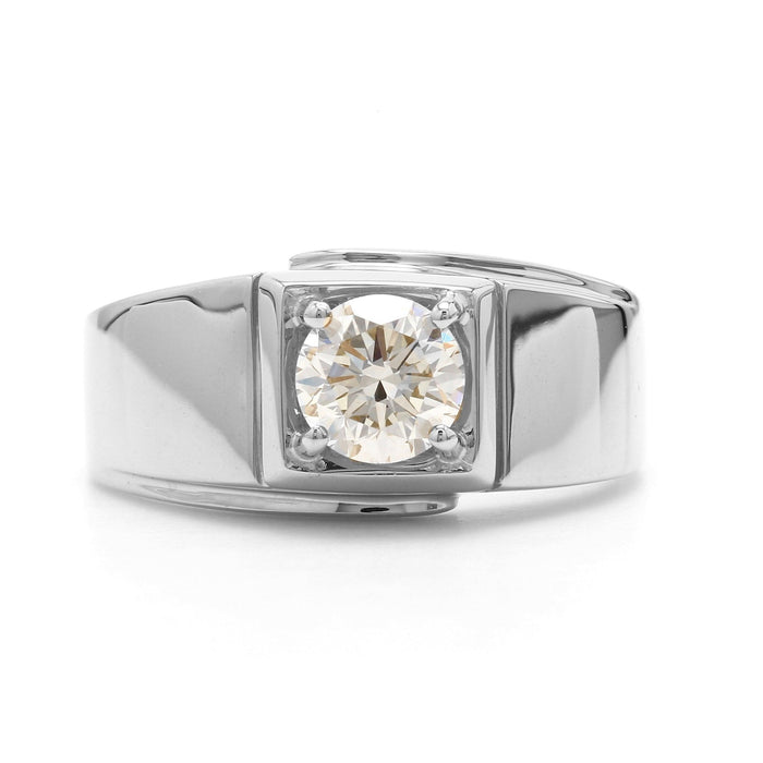 A distinguished choice, this men's lab grown diamond ring makes a great first impression. Crafted in 14K yellow or white gold, this stunning design features a square shaped center frame that showcases a dazzling 0.90 Carat round I-J / VS-SI lab grown diamond solitaire. High polished finished with a sweeping artful design adds interest to the look.
