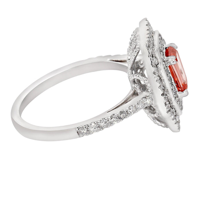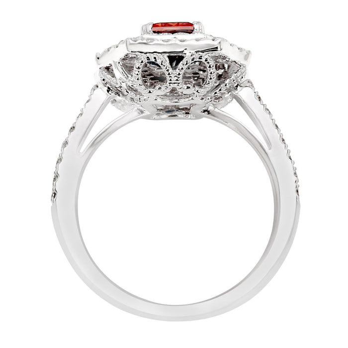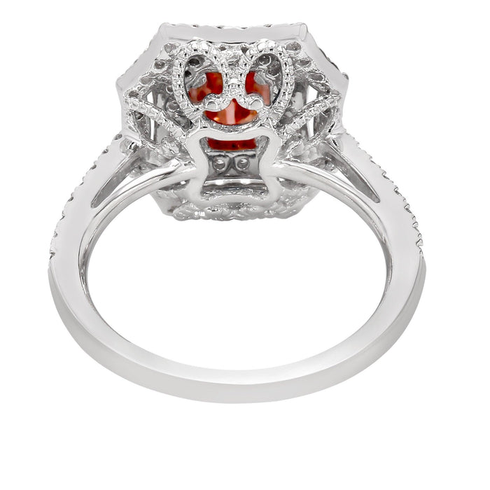 Vintage square halo meets a vibrant pop of color, what a beautiful design. Crafted in 14K white gold, this design has a 1.00 carat pink lab created diamond set in a square halo centered of dazzling white lab grown diamonds. The white lab grown diamonds have a F-G color and VS-SI clarity for a total 0.75 carats set in white gold for a great look. A ring that can be worn as an engagement ring or stunning right hand fashion statement.
