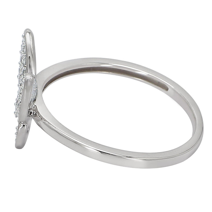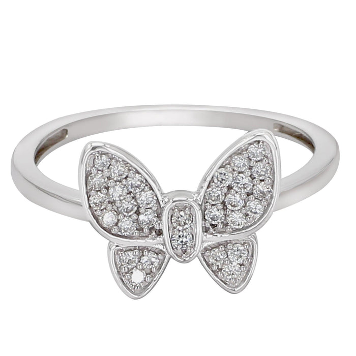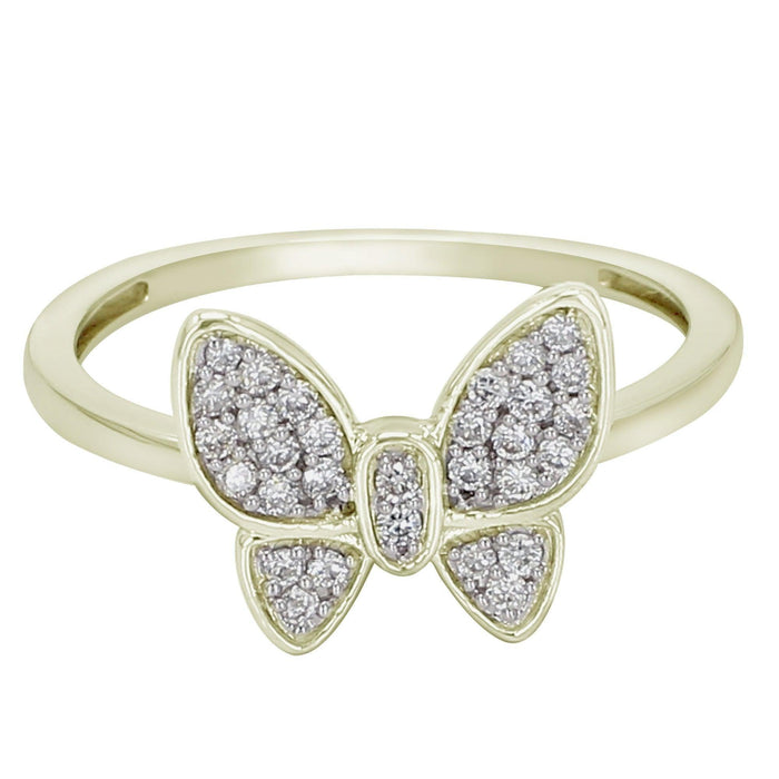 A brilliant contemporary look, this lab grown diamond butterfly ring flutters. Featuring a swirl of sparkling lab grown diamonds totaling 1/5 carat with a F-G coloring and VS-SI clarity. It's slender 14K gold style can add a flare to any outfit, day or night.