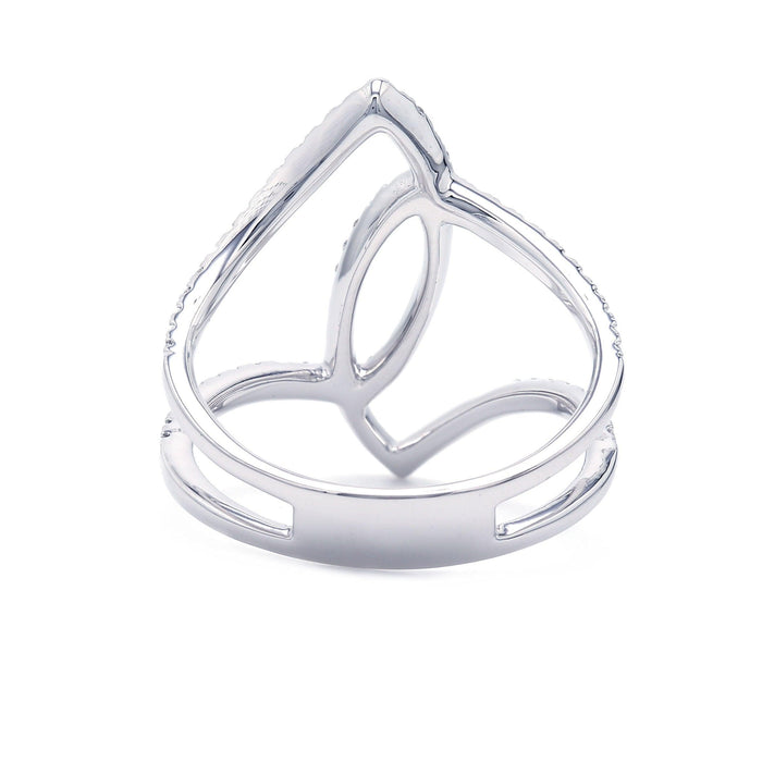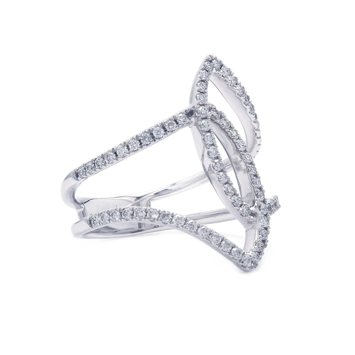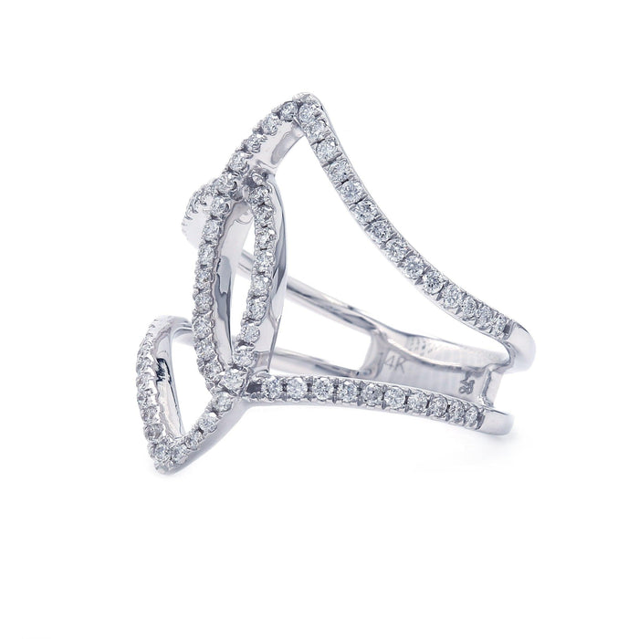 A brilliant contemporary look, this lab grown diamond free form ring is dazzling. Featuring a swirl of sparkling lab grown diamonds totaling 1/2 carat with a F-G coloring and VS-SI clarity. It's slender 14K gold style can add a flare to any outfit, day or night.